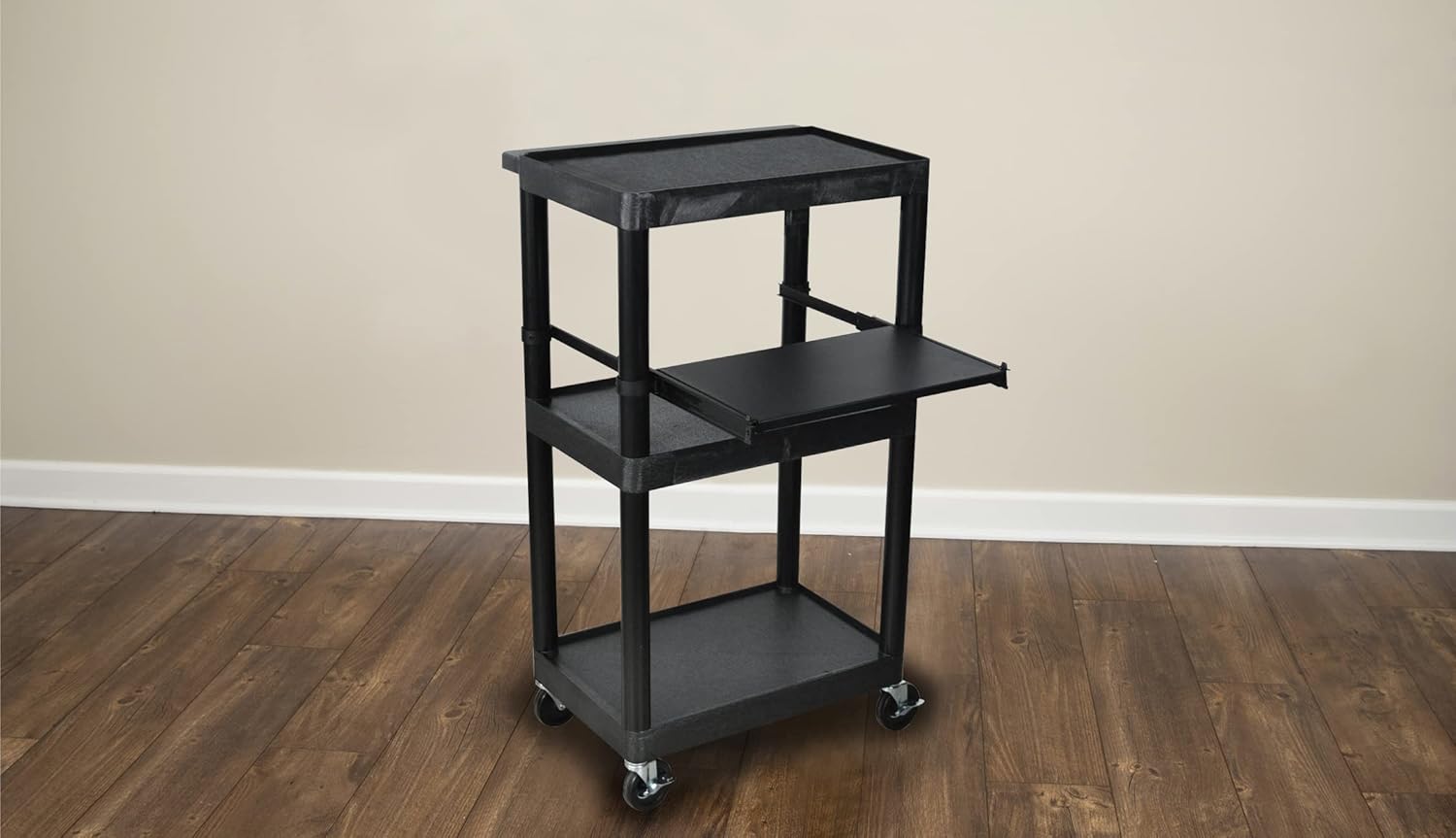 Move and store up to 300 lbs. with this rugged AV cart. Its three durable shelves are made from molded plastic that won't scratch dent rust or stain and each shelf is bordered by a .25" retaining lip to help secure items in place. Four 4" heavy-duty casters two with locking brake and a push handled integrated into the top shelf make this heavy-duty cart easy to maneuver.