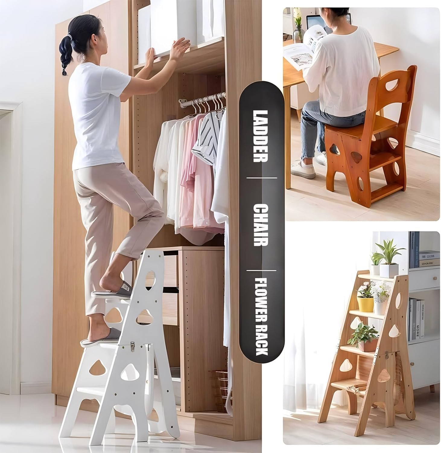 Wooden Library Ladder Chair - Multifunctional Folding 4-Step Stool Display Stand for Home, Portable Walnut Design (35x47.5x88cm)