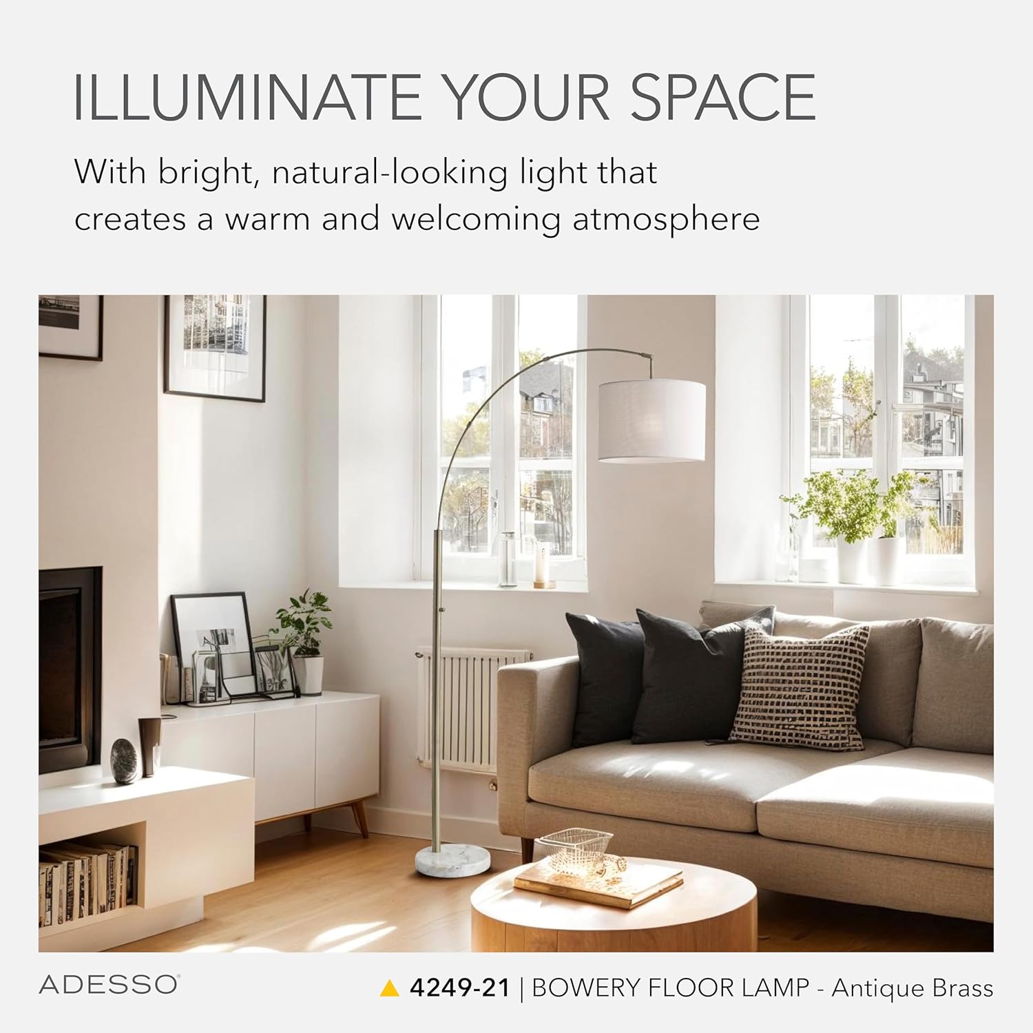 A smart and stylish way to light up a seating area, the Bowery Arc Lamp provides overhead lighting that can be controlled with an adjustable shade. Aside from functional assets, an antique brass finish is paired with a white marble base to display striking style. A 100-Watt bulb shines beautifully through an off-white textured fabric shade. An on/off rotary switch is placed conveniently on the pole. This lamp has a clear cord and is smart outlet compatible. Bulbs are not included.
