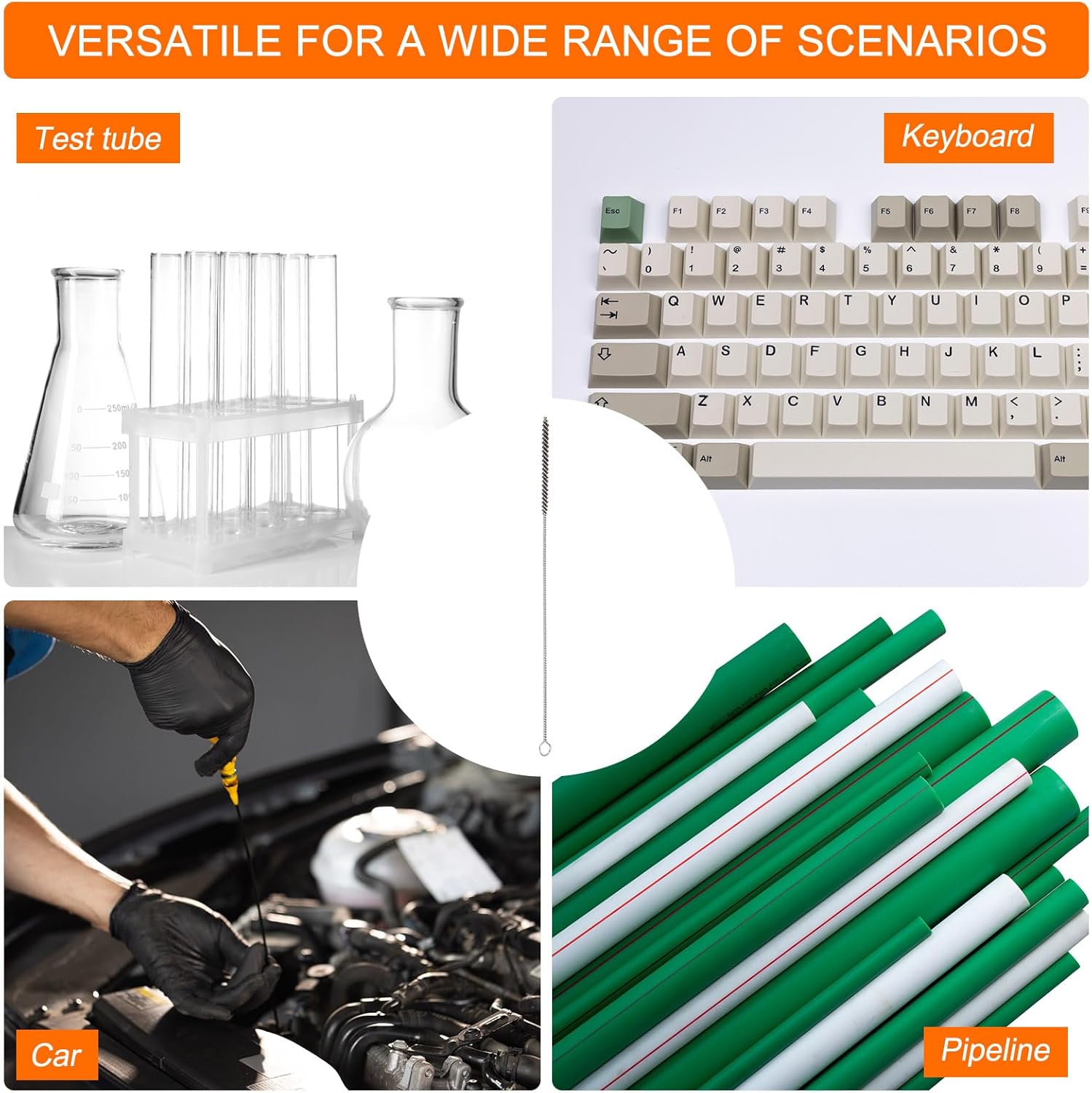 Features:1. The Tube Cleaning Brush is perfect for cleaning narrow spaces and is great for reaching into test tubes, pipes, cups, bottles, jars, vases, laboratory glassware, measuring cylinders, beakers, etc. It can also be used for cleaning cars, mechanical parts, computer keyboards, and more.2. Fan-shaped Bristles- Each brush features a fan-shaped pointed end made of soft pig bristles that can reach all surfaces and corners.3. Metal Handle- The Tube Wire Brush is equipped with a corrosion-resistant stainless steel twisted wire handle. Its moderate flexibility allows you to modify the handle shape as needed.4. NOTE- clean and air-dry the bristles promptly after use, avoid exposing the brush to humid environments.Specification:Brush Head Width: 6mm / 0.23"Brush Head Length: 100mm / 3.93"Total Length: 300mm / 11.8"Material: Pig Bristles + Stainless Steel HandleColor: Silver BlackPackage Includes:4 Pcs x Tube Bottle Wash Cleaning Brush