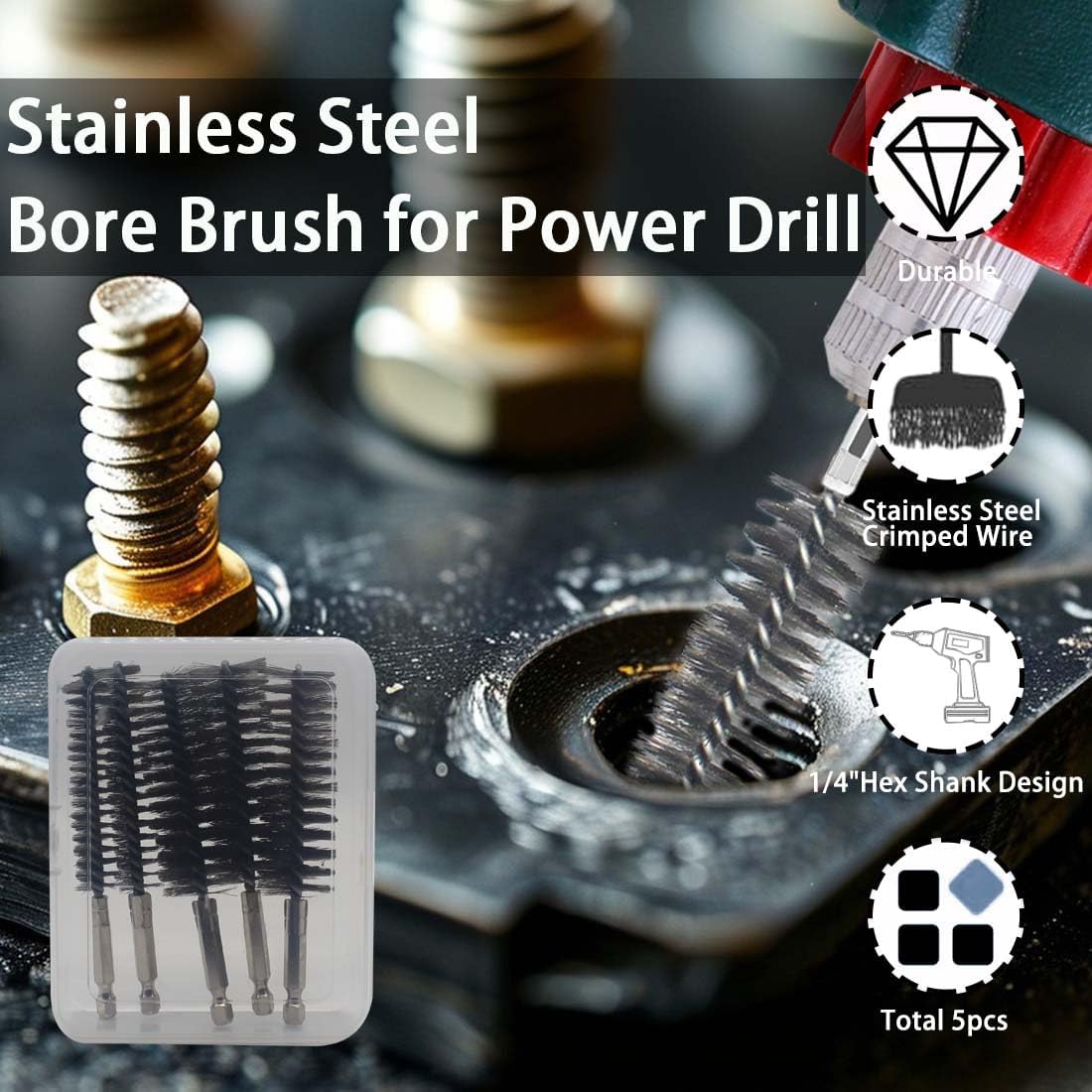 5PCS Stainless Steel Bore Brush Copper Pipe Cleaner, 15mm/25mm Twisted Wire Drill Brush, 1/4 Inch Hex Shank S2 Steel Handle, for Power Drill Plumbing Tools