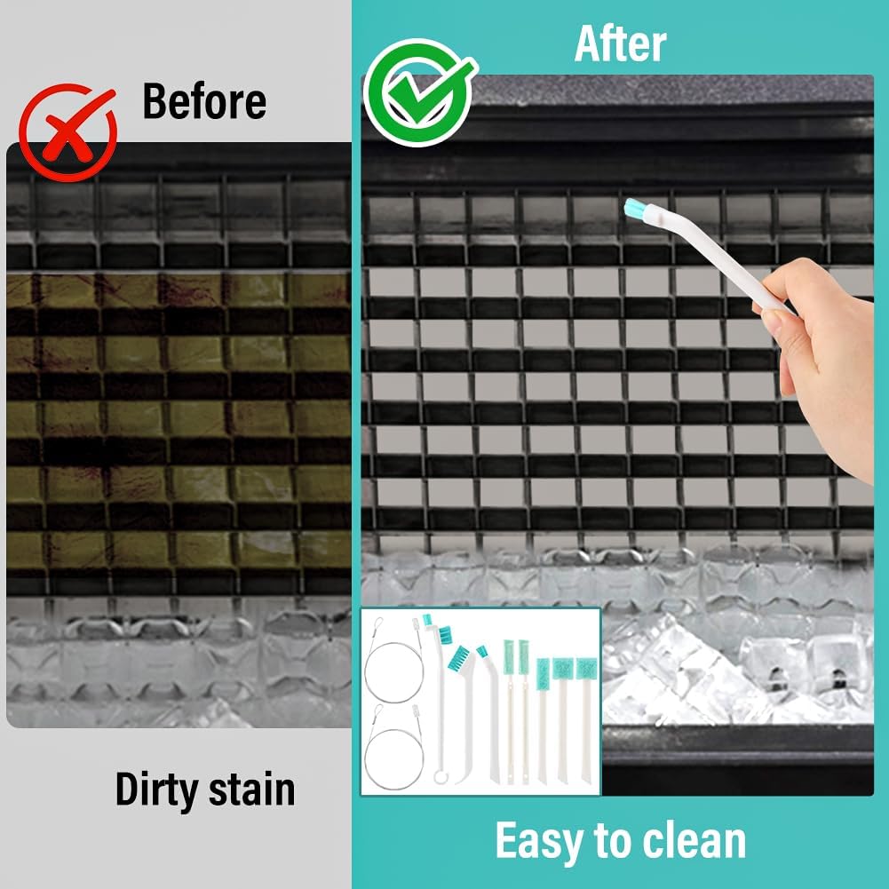 Description:【Ice Maker Cleaning Solution】2pcs extra long pipe cleaners brushes reach deep inside the ice machine's long pipes to thoroughly remove hard-to-reach dirt. 3pcs plastic brushes and 5pcs scrub sponge,precisely clean all kinds of tiny crevices, ensuring that every corner is as clean as new.【Unique Design】Unlike traditional brushes, this ice maker cleaning brush set features a 90° angle design with fine bristles that easily reach tight spaces. The pointed tail hook scrapes away stubborn dirt, and it helps lift the gasket to effectively clean hard-to-reach areas. The dual-head design allows for faster cleaning, and best of all, they are reusable and easy to store in just one cup.【Durable and Reliable】Our cleaning brush set is made of plastic materials for long-lasting durability. From ice maker descalers to refrigerator water dispenser cleaners, each component is reliable.【2PCS 55-inch long-handled Deep Cleaning brush】Our ice maker cleaning brush kit provides a comprehensive cleaning tool for everything from long pipes to tight crevices. The extra-long 55in pipe cleaning brushes reach deep into the ice machine's pipes to remove dirt hiding in hard-to-reach places.【Easy To Operate】Each cleaning brush in the ice maker cleaning brush kit has been carefully designed to be easy to handle and hold.Whether it's a long pipe or a small crevice, it's easy to handle, making the job of cleaning your ice machine simple and effortless.Specification:Color: White+BlueMaterial:PlasticSize: Cleaner Brush: 5.6 x 0.9 inchSpring Brush: Length 55 inchPackage includes:10 Pcs Ice Machine Cleaner Brush SetNote:1. Due to the light and screen difference, the item's color may be slightly different from the pictures.2. Please allow 1-2 cm differences due to manual measurement.