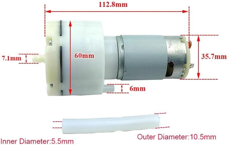 Specification:1.Model: CY36AM 2.Type: Mini Air Pump / Vacuum Pump 3.Motor: Micro 555 Motor 4.Rated voltage: DC 12V 5.No-load current: 0.55A 6.Positive pressure: 60Kpa 7.Negative pressure: -60Kpa 8.Flow: 10L/min 9.Weight: 290g 10.Pump head diameter: 60mm 11.Air inlet diameter: 6mm 12.Air outlet diameter: 7.1mm 13.Usage: mattress/massage sofa/massage chair air pump, household appliances, fragrance expander, vacuum packaging machine, screen remover, etc 14.Note: The greater the voltage, the great the current,the greater the air flow and the greater the noise.===============Package List:Air Pump x 1PCS