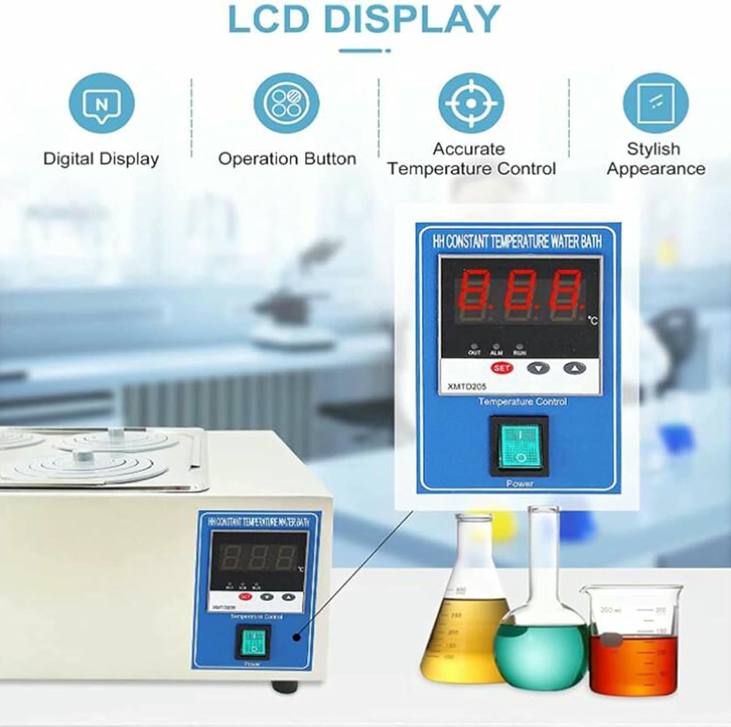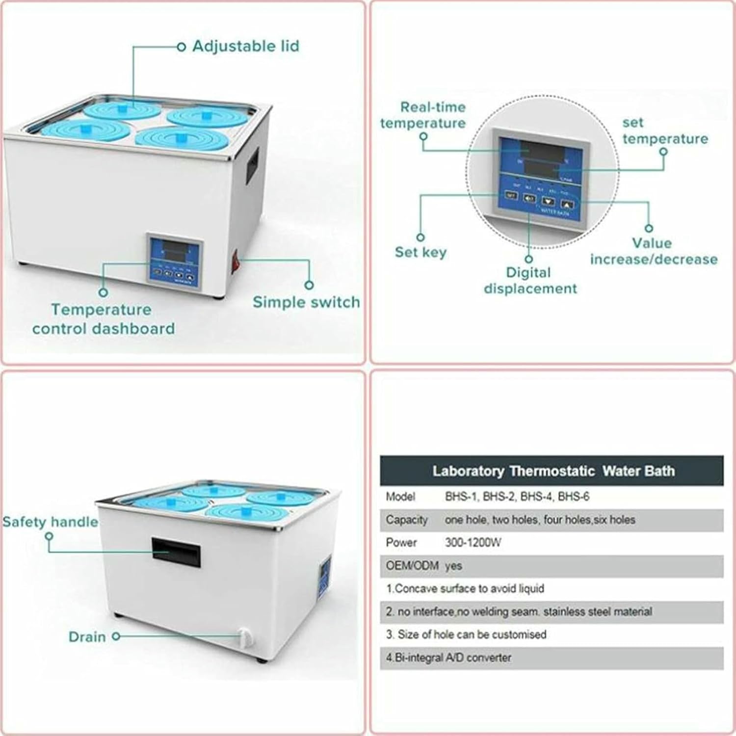 Characteristics:Digital temperature visualization and controlThe screen shows the real temperature and adjustment point.The temperature is controlled by an PID controller.It also has a timing function.304 stainless steel cavityThe unique molding process, without interface and without welding joints, can prevent oxide and corrosion.Distilled water is recommended on this device.SpecsName: Smart temperature water bathSingle hole:Power: 300WExternal dimension (mm): 200*200*200Interior size (mm): 160*160*140Double hole:Power: 600WExternal dimension (mm): 350* 200* 200Interior size (mm): 300* 160* 140Four holes:Power: 800WExterior dimensions (mm): 350*350*200Interior size (mm): 300*300*140Six holes:Power: 1500WExterior dimensions (mm): 510*350*200Interior size (mm): 470*300*140Temperature range: Ambient temperature ~ 99.9 (℃)Temperature fluctuation: 0.1 (℃)Temperature Control Method: Electric heatingVoltage: 220 v/60 HzInner wall material: 304 stainless steelScope: Medical Scientific Research Chemical BiologyPackage Included1*Adjustable ring cover1*Instructions1*Waterproof support1*Cable feedDue to the different measurement methods, it is normal for a measurement error of 1 to 2 cm.