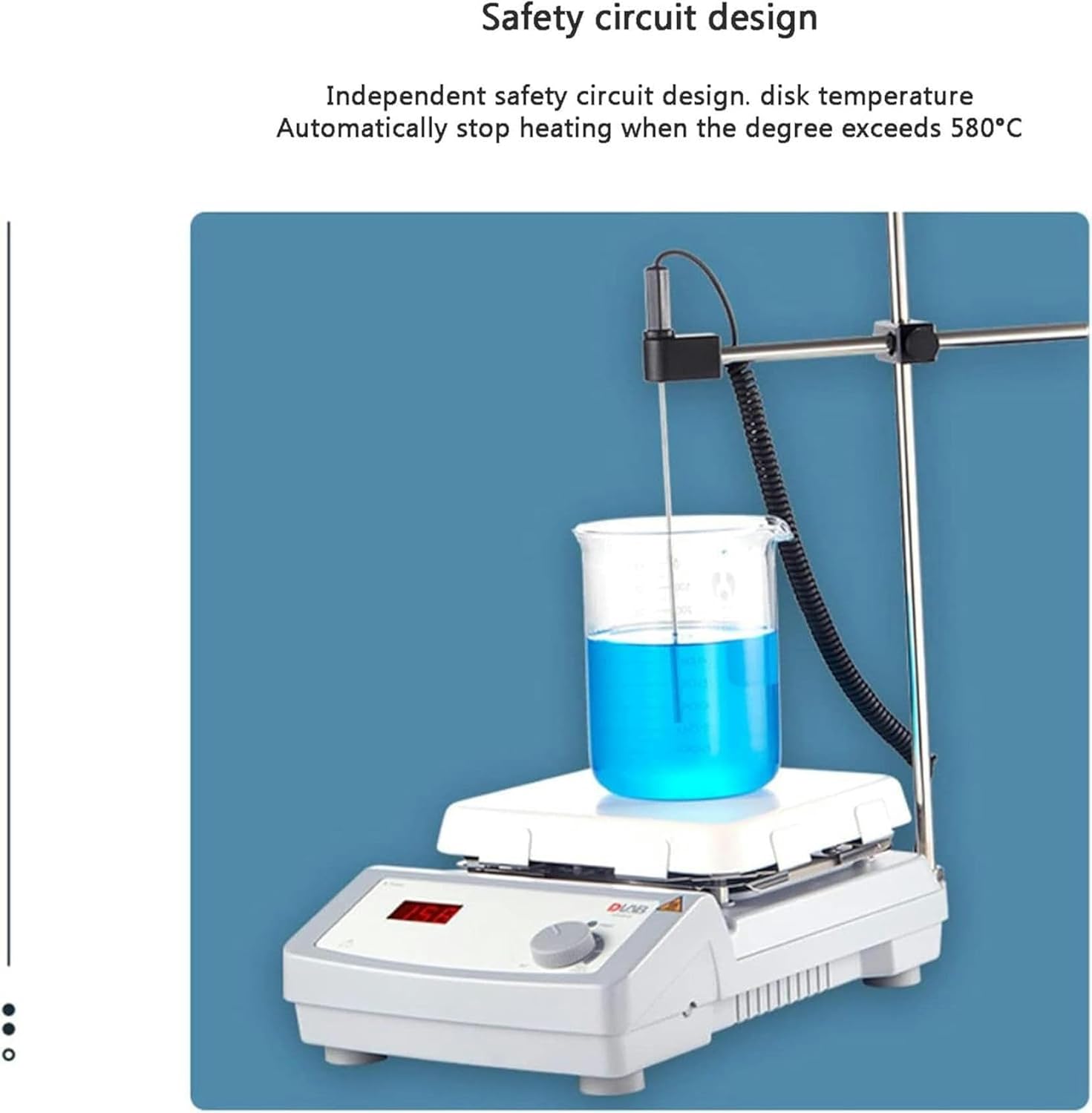Model:Features:LED display screenOverheat protectionChemical corrosion resistanceWaste heat warningRapid heatingIndependent safety circuitProduct features:Heating plate size (width x height): 184 x 184 millimeters (7 inches)Heating plate material: glass ceramic.Power: 1010 wattsVoltage/frequency: 100~120/200~, 50/Heating power: 1000WNumber of heating points: 1Heating temperature range: room temperature to 550C, step 5CTemperature control accuracy of heating plate: ± 10 ℃Safe temperature: 580%Temperature display: LEDTemperature display accuracy: ± 1CExternal temperature sensor: PT1000 (± 0.59C)Waste heat warning: 50C