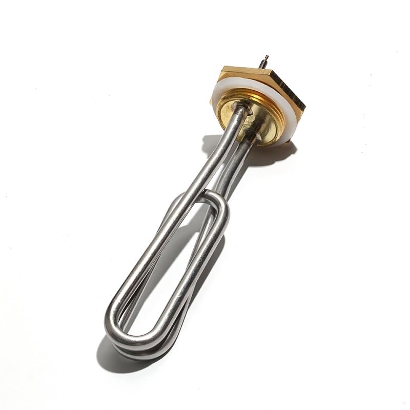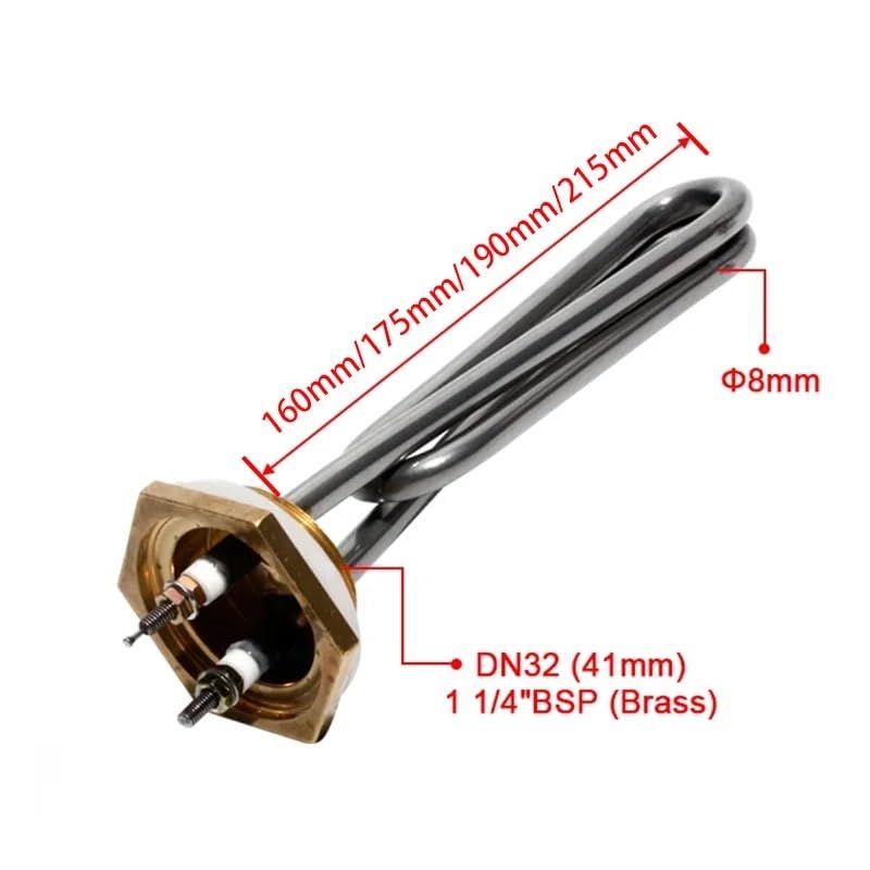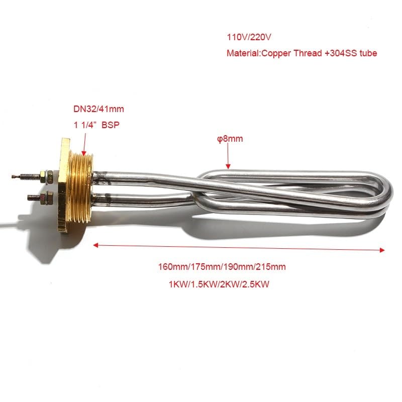 DN32 41MM G1 1/4" Electric Heating Element 110V 220V Copper Thread Immersion Heater Folded Resistance Tube 1500W 175MM1.Material: Copper thread+304SS Tube2.Voltage: 220v/110v3.Wattage: 1kw/1.5kw/2kw/2.5kw4.Tube length: 160mm/175mm/190mm/215mm5.Thread: DN32/41mm/G1 1/4" BSP thread6.Package:1pc heating element + 1pc gasket Origin : Mainland ChinaProduct Name : Hexagonal threaded electric heating pipeThread Size : DN32(G1.25)Material : Copper thread+304SS tubeVoltage : 110V/220VWattage : 1/1.5/2/2.5KWApplication : Boiler heater, tank heater, mold heaterCertificate : CE, ROSH, LVDAccept Custom Made : Yes