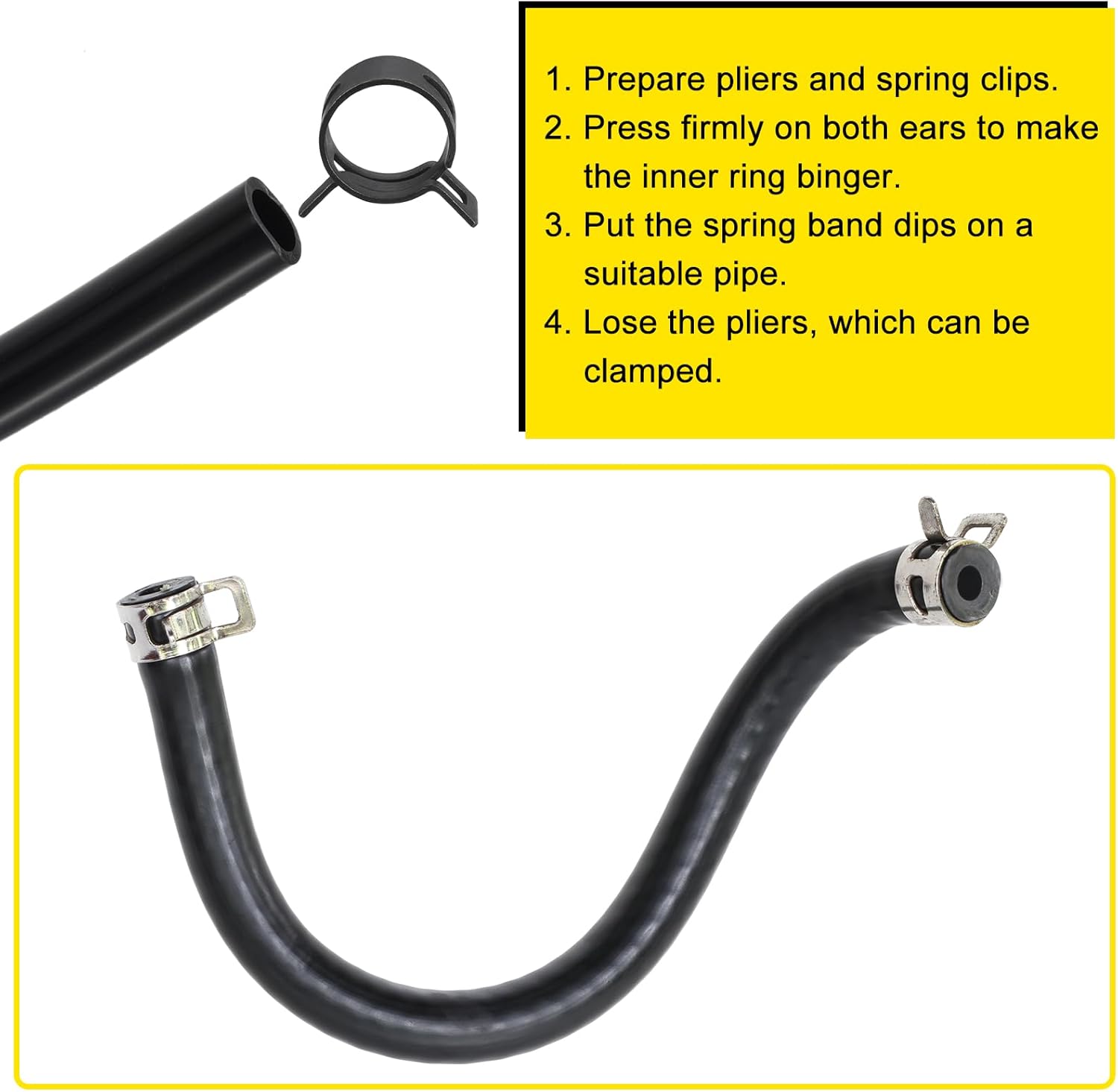 Description: 1. Material: Our spring hose clamps are made of 65 manganese, which is wear-resistant, not easy to rust, and not deformed. 2. Design: The spring band clamp is a self-adjusting sealing component that connects the hose to the part to prevent flow leakage. The 360° inner ring clamp is precisely and sturdy designed to withstand certain pressure and tension. This design keeps the bolts away from the clamping surface, facilitating tightening and enhancing the leak-proof effect. 3. Easy to use: Installation is quick and simple. You only need to use tools such as wrenches to place the steel hose clamp on the equipment that needs to be connected or fixed, and make sure the connection is firm. These clamps have great flexibility and strength, and can ensure reliable leak-proof connections by firmly tightening the hose to the part. 4. Wide Application: Hose clamps are used to tighten and seal interfaces, they are suitable for fuel lines, air hoses, water pipes, fuel lines, silicone vacuum hoses, mechanical tools, fire fighting equipment and other mechanical equipment, etc. Specifications: Colour: black. Material: 65 Manganese Surface Treatment: Chrome Zinc Coating Inner diameter: 7 mm / 0.28 inches. Hose Clamp Size: 16mm x 16mm x 8mm / 0.63" x 0.63" x 0.31" (L*W*H) Thickness: 0.6 mm / 0.02 inches. Package Contents: 18 Pieces of Action Band Type Spring Hose Clamp