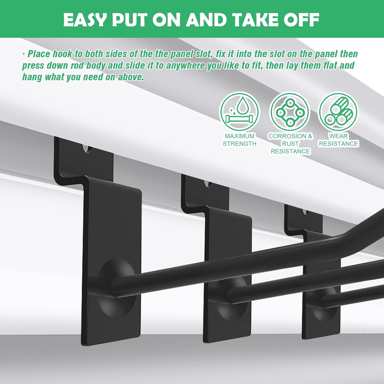 • [Easy Put On And Take Off] No tools required. Fit most standard siding panels and and slat grid panels. Place hook to both sides of the the panel slot, fix it into the slot on the panel then press down rod body and slide it to anywhere you like to fit, then lay them flat and hang what you need on above. Easy put on and take off. Effectively creating room for your workspace or home.