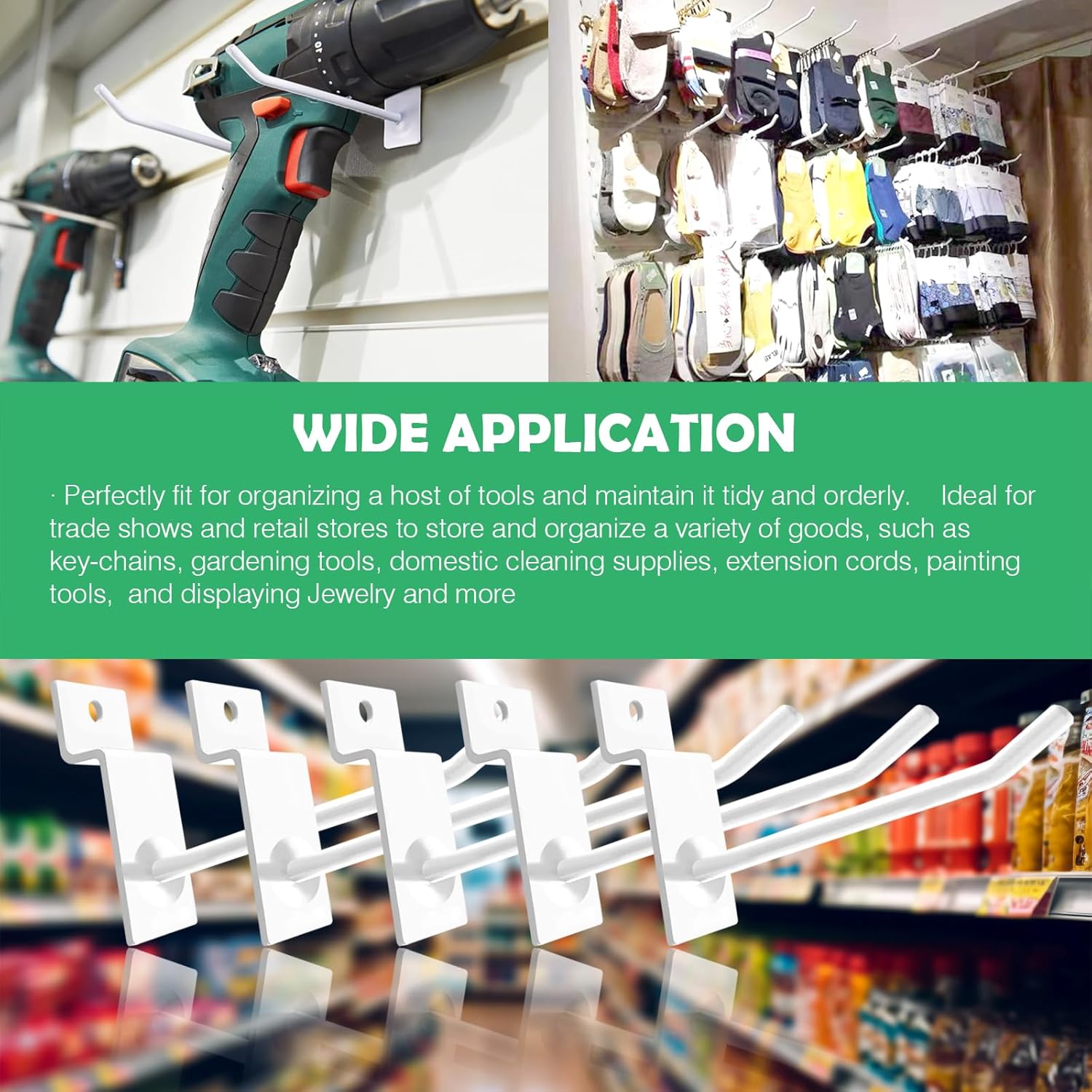 • [Wide Application] Perfectly fit for organizing a host of tools and maintain it tidy and orderly. Ideal for trade shows and retail stores to store and organize a variety of goods, such as key-chains, domestic cleaning supplies, gardening tools, painting tools, extension cords and displaying Jewelry and more. A must have display hook for garages, hardware stores, home improvement stores, locksmiths and retail stores.