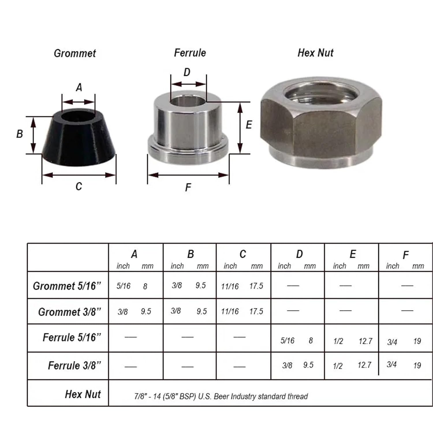 BarsJockey Box 8mm/9.5mm Compression Fitting SetThis Jockey box fittings set is a set of two grommets, two ferrules and two hex nuts that allows you to connect an ice box coupler and a jockey box shank to a jockey box coil. This set is also great to keep on hand for whenever a fitting needs replacing.Package Included:* grommet - 2* ferrule - 2* hex nut - 2==========Product Type : Wort ChillersMaterial : STAINLESS STEELOrigin : Mainland