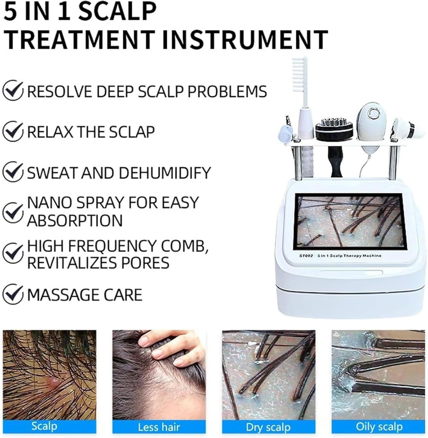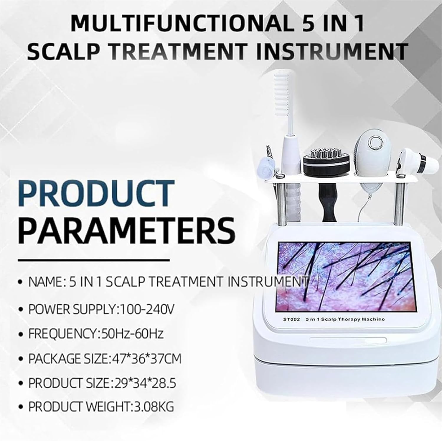 Can be used in homes, commercial beauty salons, spas, etc., and can be used with a variety of products.Product parameters:Name: 5-in-1 scalp care deviceMaterial: ABSPower supply: 100-240VFrequency: 50Hz-60HzWorking mode: probe works independentlyDisplay:7/10-inch ultra-high-definition LCD displayPixels: 7/10 million pixelsResolution: 800x480Packaging size: 47*36*37cmProduct size: 29*34*28.5cmProduct weight: 3.5kg.