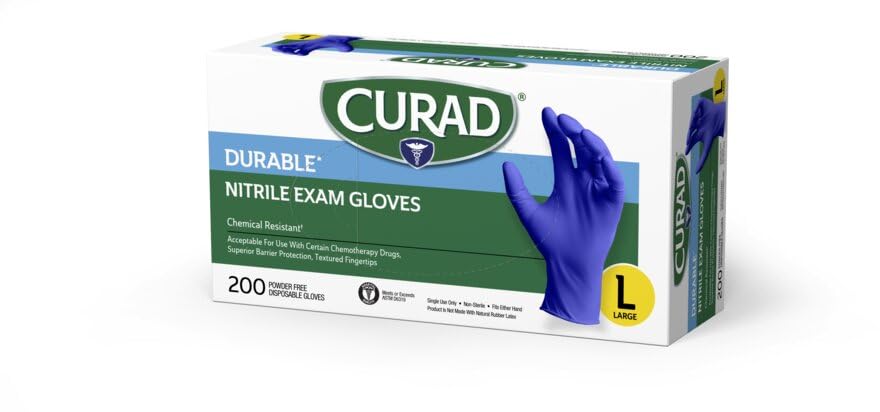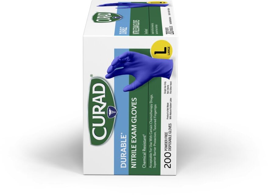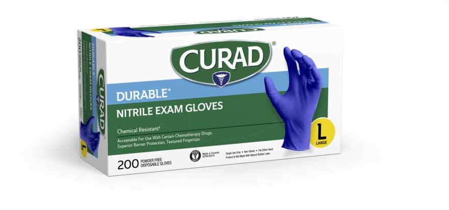 CURAD® Durable Nitrile Exam Gloves are chemically resistant and are designed to create a barrier between the skin and caustic substances or bodily fluids. They are powder-free, ambidextrous, and disposable, but won’t cause allergic reactions since they do not contain natural rubber latex. Please note that these gloves are non-sterile and should not be used for applications requiring sterility.