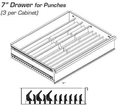 Versatility’s 5-Drawer Press Brake Tooling Cabinet for European Style Tooling, VT-23000Work Safer, Increase Efficiency and Protect Tools Organizes and protects up to 49 tools and guide assemblies: 16 full-length dies and 33 full-length punches and is built extremely strong for long years of shop life.Compliments "Lean" and "5S" Initiatives. Increase Green Light Time!FEATURES and BENEFITS- Maximum tool length is 34” (863mm) - Qty (2)- 3" Drawer: Maximum Die Height - 3" (76mm), Qty (3)- 7" Drawer: Maximum Punch Height - 5-3/16" (132mm) - Tubular Size Handle with Grips - Vinyl Black Top and Mobile Base - Lasting Powder Coat Finish - Robotically MIG Welded 14-, 16- and 18-gauge construction for strength and durability.- Standard integrated retainer top keeps items from falling off the cabinet- 4 Heavy Duty 6-inch diameter casters (900 pound capacity each); 2 rigid and 2 swivels with brakes - Patented 1-ata-Time drawer interlock system allows only one drawer to be opened at a time.
