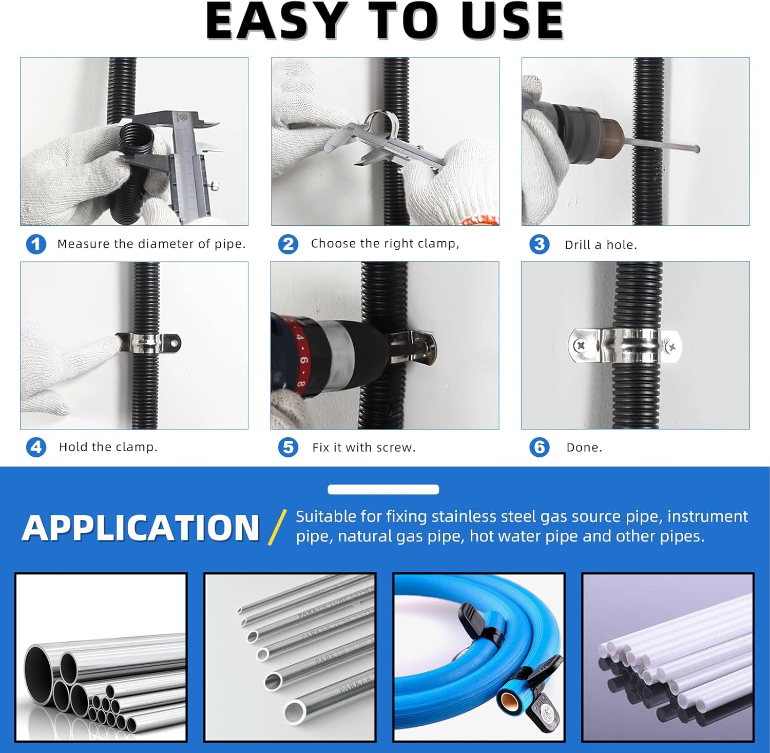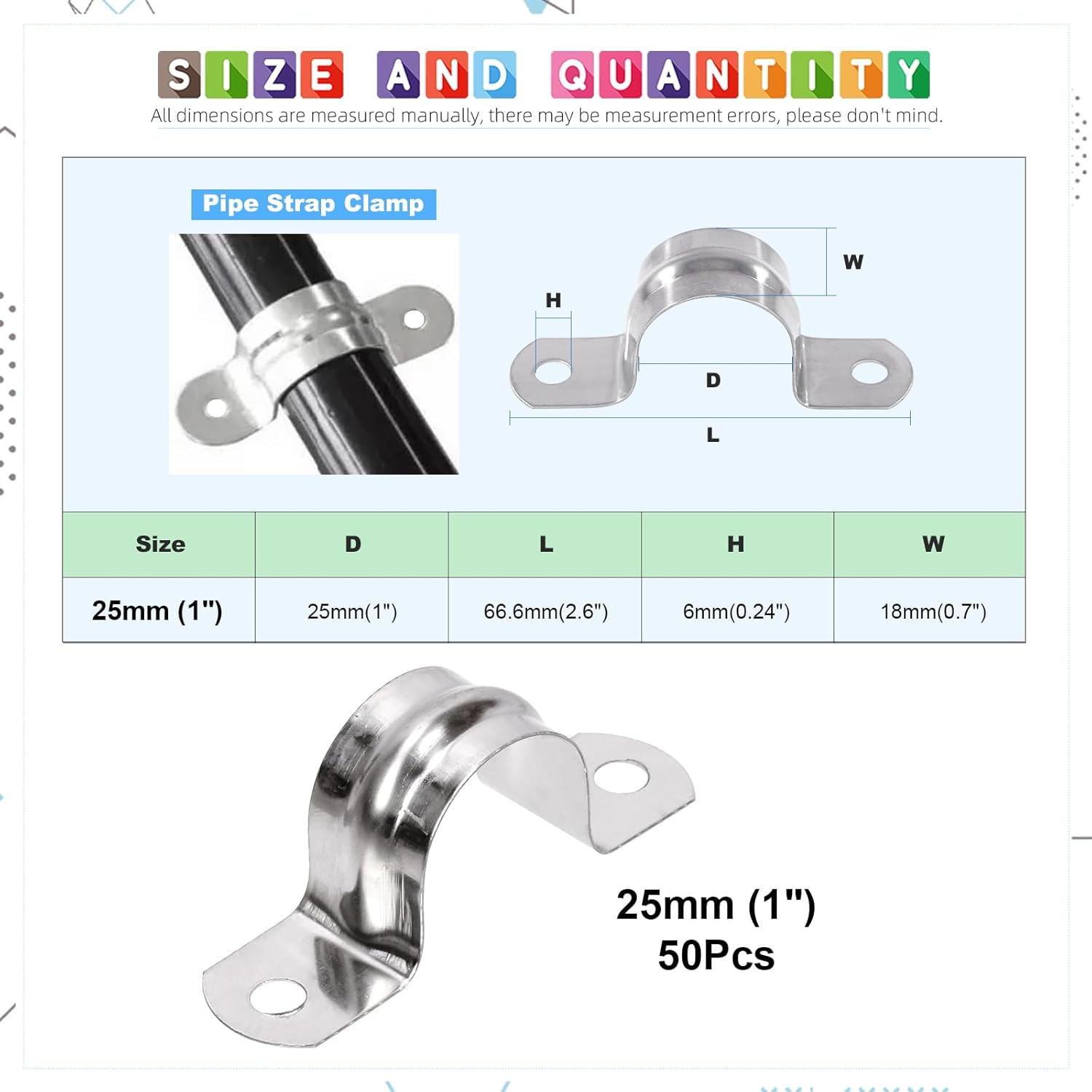 Glarks 50Pcs M8 Pipe Strap Clamp, 304 Stainless Steel 2 Hole Strap Heavy Duty Rigid Pipe Strap U Bracket Tube Strap Cable Clamp Hanger Tension Tube Clip for Pipe Tube Cable Fixing (25mm (1")) 👍 [Specifications]: ➤ Product Type: Pipe Strap Clamp ➤ Material: 304 stainless steel ➤ Color: silver ➤ Size: 25mm (1 inch) ➤ Quantity: 50pcs 👍 [Product Features]: ☛ Sufficient number and commonly used size of pipe straps are enough for your daily installation demands. ☛ Made of high quality 304 stainless steel material, our pipe straps are not easy to fade or rust after prolonged use. ☛ Our shop provide different size of tube straps, which can meet your different installation needs. ☛ Come with a smooth and free-burr surface and edges, our pipe straps can be used with confidence. ☛ This tube strap can be used for fixing different pipes like rubber pipes, oil pipes, plastic steel pipes, etc. 🧾 [Package Details]: ♥ 50pcs x 25mm (1 inch) pipe straps 🥇 [Note]: ※Due to the difference screen displays, there may be slight color difference.V
