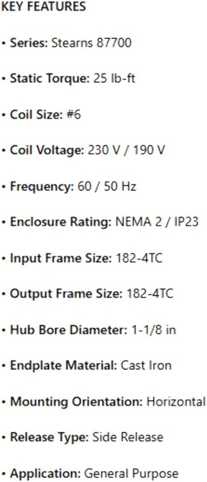 108773101FG, 25FT-LB 87700 Series NEMA IP23 Coupler BrakesKEY FEATURESSeries: Stearns 87700Static Torque: 25 lb-ftCoil Size: #6Coil Voltage: 230 V / 190 VFrequency: 60 / 50 HzEnclosure Rating: NEMA 2 / IP23Input Frame Size: 182-4TCOutput Frame Size: 182-4TCHub Bore Diameter: 1-1/8 inEndplate Material: Cast IronMounting Orientation: HorizontalRelease Type: Side ReleaseApplication: General Purpose