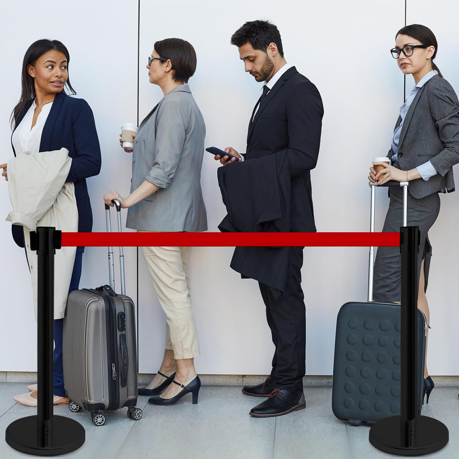 Features: Simple to match: With classic color and simple design, the stainless steel stanchion can match well with various themed decorations, providing you with much convenience. Ideal for storing: When the crowd control barriers are out of use, you can disassemble them and keep them easily, and they will not take up too much space in your place. Specifications: Main material: Pole: stainless steelStanchions base: plastic and metalMain color: black, redSize: Stanchions: about 6.6 ft/ 2 m in heightBase: about 12.6 inches in diameterRetractable belt: about 6.6 ft/ 2 m in lengthPackage includes: Set of 4 stanchions with retractable beltsNotes: Manual measurement, please allow slight errors on size. The color may exist a slight difference due to different screen displays. Winding risk may exist, please keep away from little kids.