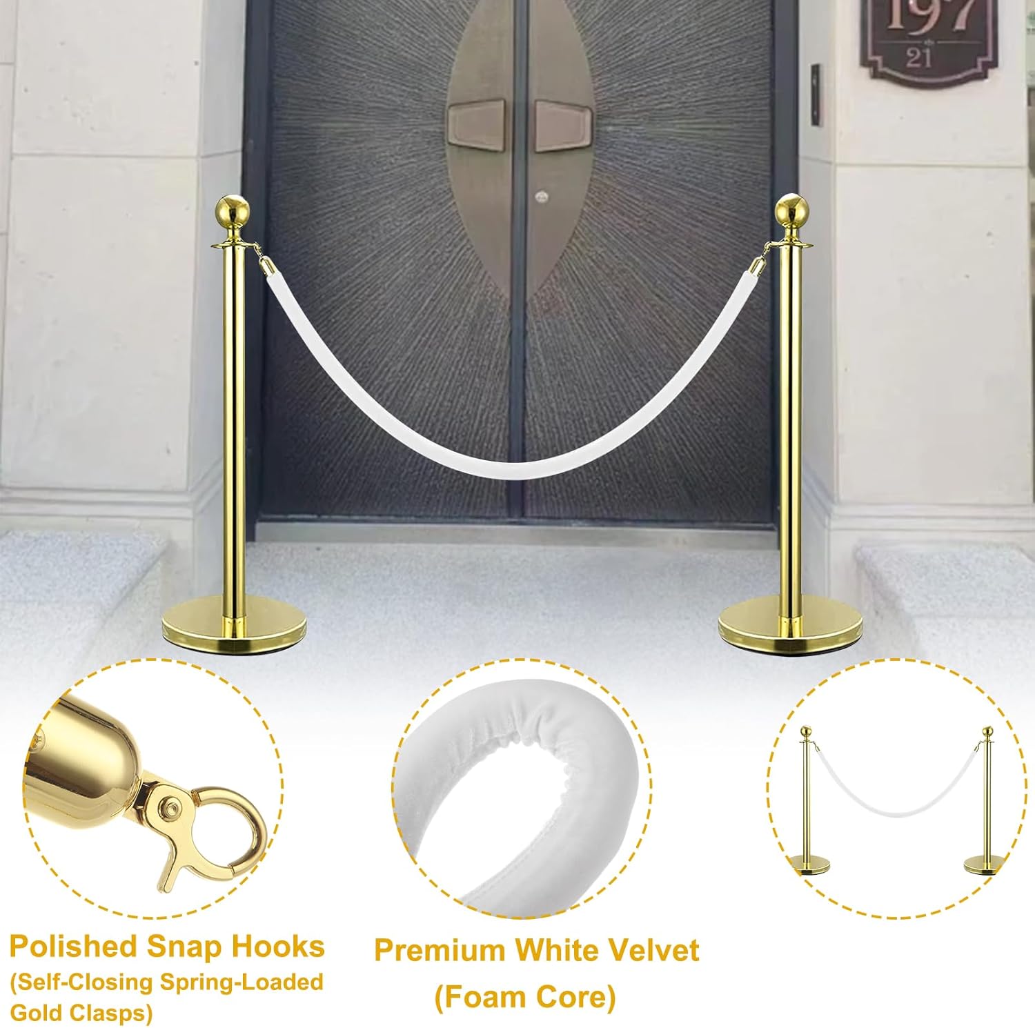 FVIEXE 4 Pack 5 Feet White Velvet Stanchion Rope, Crowd Control Ropes with Gold Clasps, Foam Core Queue Safety Sarriers Stanchion Post Rope for Party Event and Red Carpet Features 1. Universal stanchion rope, compatible with any decorative rope stanchion 2. Constructed by a crush resistant foam core and covered with premium white velvet, comfortable when touching 3. Feature an upscale look, add a touch of elegance to your events Specifications Size: 5 Feet Color: White Material: Velvet, Metal Package Included 4 x Velvet Stanchion Rope