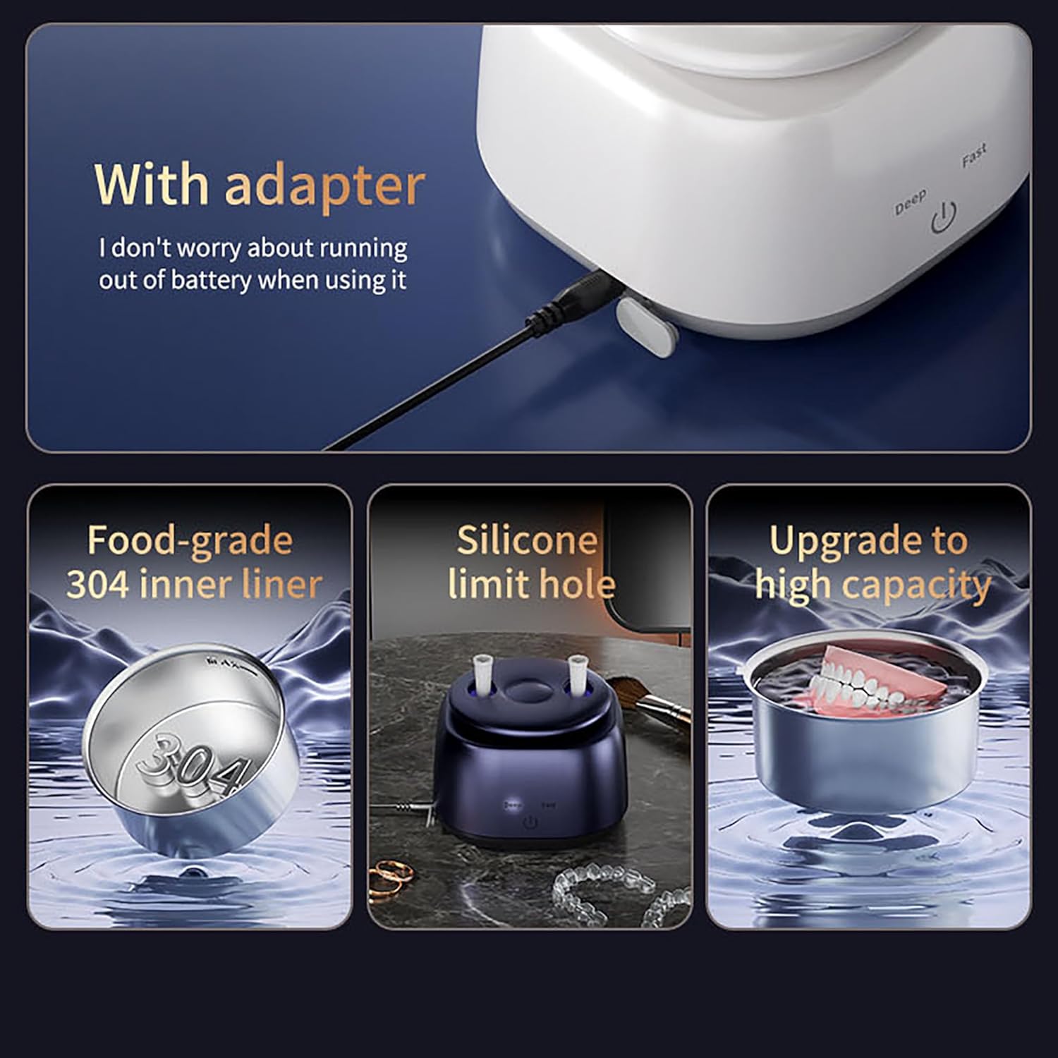 Experience professional-grade cleaning with this advanced 48kHz ultrasonic cleaner. Featuring a food-grade 304 stainless steel inner liner and high-capacity design, this versatile device delivers powerful deep cleaning for dentures, jewelry, contact lenses, and dental braces. The unit comes with a convenient adapter for continuous operation, eliminating battery life concerns. The sleek, modern design includes a silicone limit note for safe operation, while the upgraded capacity accommodates various items simultaneously. The ultrasonic technology generates microscopic bubbles that effectively remove dirt, debris, and buildup from hard-to-reach spaces. Simple to operate with deep and fast cleaning modes, this device combines convenience with professional-level results. The durable construction and premium materials ensure reliable performance for all your cleaning needs, whether at home or in a professional setting. Perfect for maintaining the hygiene and appearance of your valuable items with minimal effort.