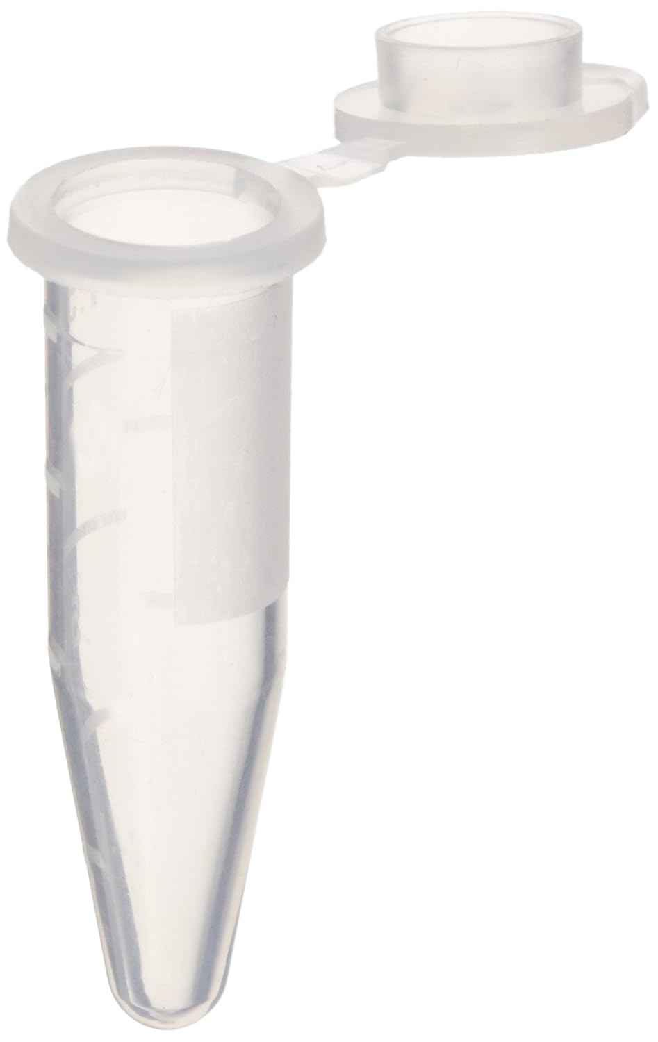 This microcentrifuge tube features a flat top cap which provides a positive and secure seal when closed, thus providing maximum protection for contents. Fabricated with virgin polypropylene for excellent chemical resistant qualities and good clarity. The tube has high impact strength and will withstand 17000RPM and 13000 x g centrifugation. Thicker walls make this the tube of choice for extreme stress, high spinning speeds, autoclaving, boiling, chemical resistance, and freezing. This microcentrifuge tube has a textured writing surface on top of the cap and on the side of the tube. It is graduated from 0.1, 0.25, 0.5, 1.0, and 1.5mL. The interior has the smoothest, most highly polished surface of any tube on the market. The walls are non-wettable, preventing contents from adhering to the side walls. Needle access is fast and easy through the target in the exact center of the lid. Autoclavable. Chemical Resistant. Graduated. Material: Polypropylene. Top Style
