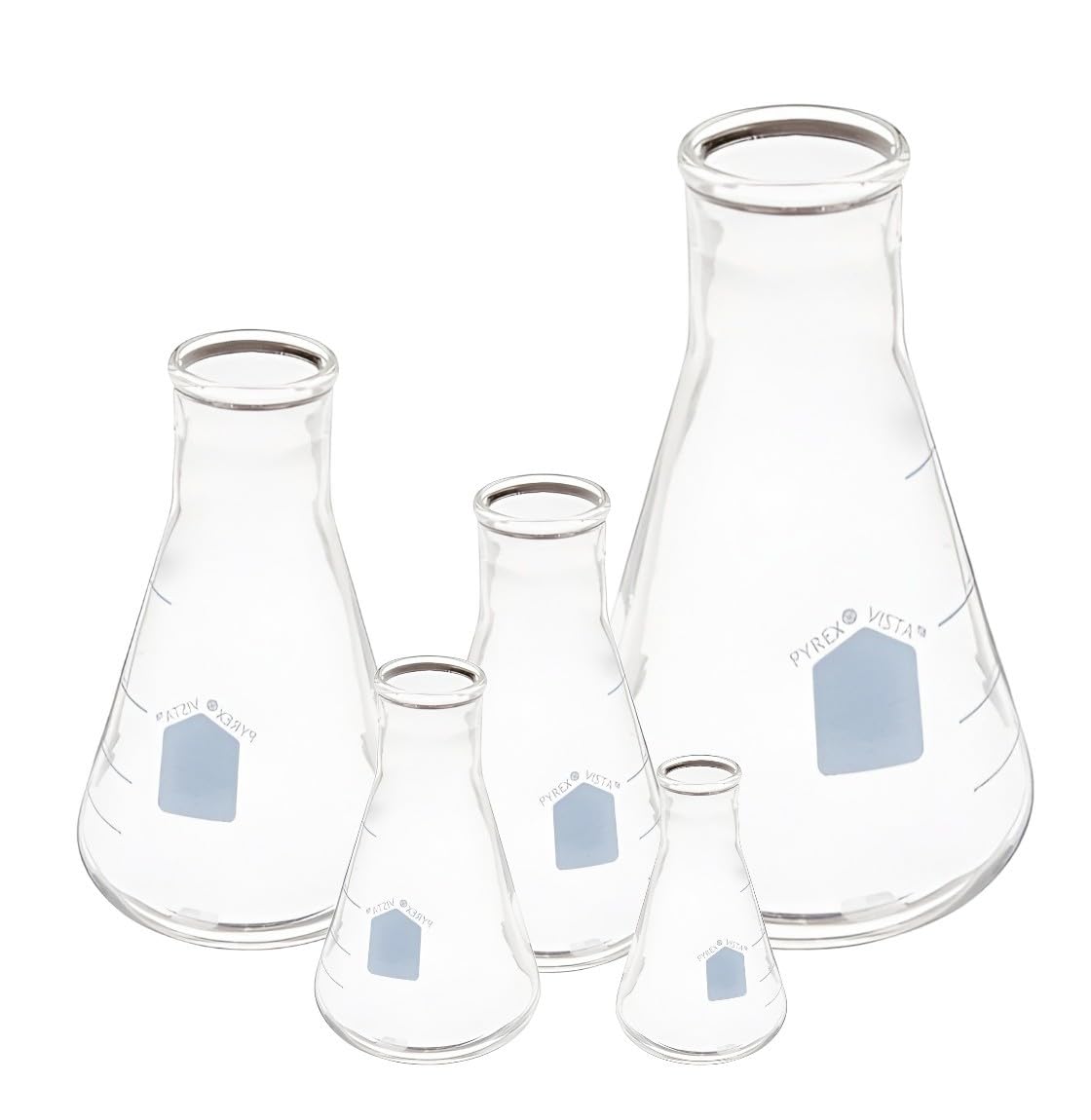 These 250 mL PYREX VISTA Erlenmeyer flasks have uniform wall thickness which provide balance between mechanical strength and thermal shock resistance. Approximate graduations are in durable blue enamel.