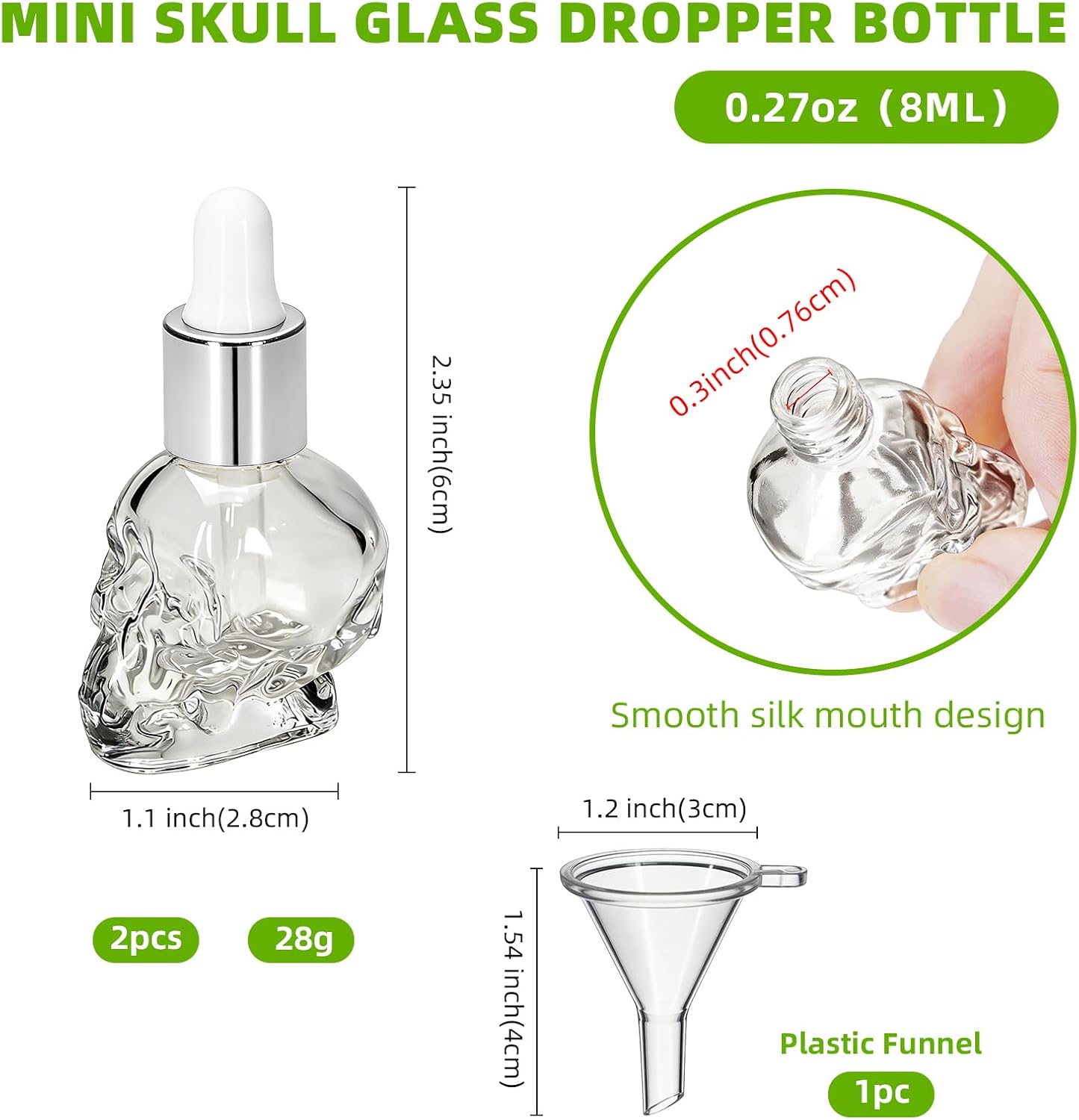 This 8ml mini glass dropper bottle features a unique skull-shaped design that stands out from ordinary containers, combining creativity with practicality. Made of high-quality clear glass, it allows easy visibility of the liquid inside while ensuring durability and safety. Equipped with a soft rubber dropper for precise liquid control and a bonus plastic funnel for easy filling, this bottle is perfect for essential oils, perfumes, serums, or DIY liquid storage. Its compact size makes it ideal for travel, parties, or daily carry.