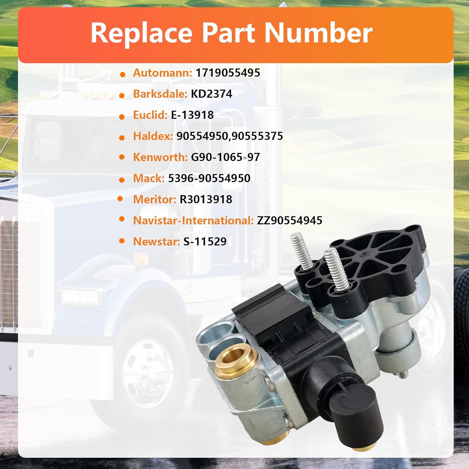 Features: Material: Metal Color: Black Type: Vehicle Specific Part number: Automann: 1719055495 Barksdale: KD2374 Euclid: E-13918 Haldex: 90554950, 90555375 Kenworth: G90-1065-97 Mack: 5396-90554950 Meritor: R3013918 Navistar-International: ZZ90554945 Newstar: S-11529 Package included: 1 X PR Plus Height Control Valve Compatible with Freightliner International Kenworth Mack Volvo Peterbilt semi trucks trailers