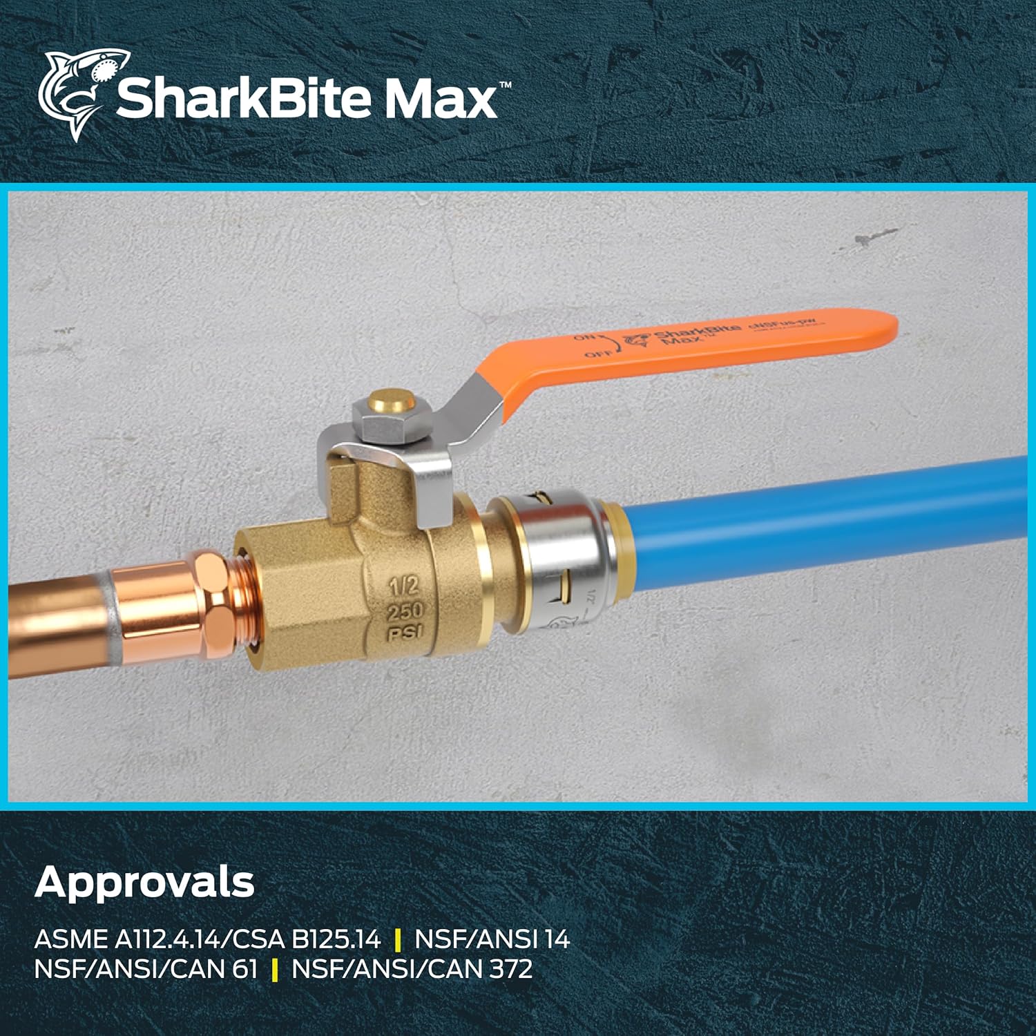 Simplify your plumbing and home improvement projects with the SharkBite Max brass push ball valves with FNPT connector. Composed of strong and sturdy lead free DZR brass with a reinforced stainless-steel collar, these ball valves are a great way to easily transition from a female NPT threaded end to a PEX, copper, CPVC, PE-RT and SDR-9 HDPE pipe in any combination! SharkBite Max quick connector fittings are a project time and effort saver with less insertion force required for a stronger connection. Without the need for additional tools, glue, or soldering, these valves with FNPT connector can be installed in wet lines and are approved for underground and behind-the-wall applications with no access panels (Wrapping required when burying underground). Additionally, this SharkBite Max fitting adapter can be used to join different pipe types together seamlessly providing the versatility to make repairs of existing lines faster and more reliable. Rated to 200 degrees F and 400 PSI.