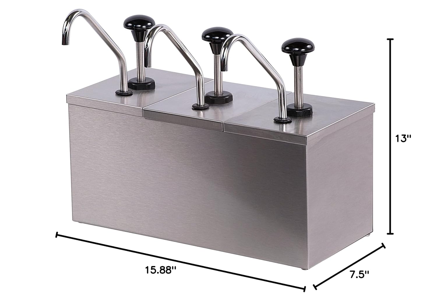 This condiment dispenser is a versatile addition to any food service environment. This dispenser offers adjustable portions, giving you full control over condiment servings with pump and restrictor clips that dispense 1/2 ounce, 1 ounce, or 1 1/4 ounce portions, ensuring consistent and precise serving every time. Its insulated interior is designed to maintain your condiments at their ideal serving temperatures. Included ice packs help keep condiments fresh, ensuring they're always ready to enhance your culinary creations. This dispenser has the unique ability to serve three different condiments simultaneously, making it the perfect solution to cater to diverse flavor preferences. Whether you're running a restaurant, deli, or any food service establishment, it offers the convenience and flexibility you need. Designed to protect the contents from environmental contaminants, our dispenser keeps your condiments covered and safe, ensuring their quality remains intact. Say goodbye to dust, debris, and unwanted particles affecting your condiments. Built to last, our dispenser boasts a sturdy stainless steel construction, capable of withstanding the demands of busy food service environments. Its durability guarantees longevity, making it an essential component of your setup. With rubber feet to protect surfaces and prevent slipping, this dispenser offers stability and safety. Its timeless design seamlessly complements a variety of restaurant and deli décor styles, providing both functionality and aesthetic appeal to your establishment.