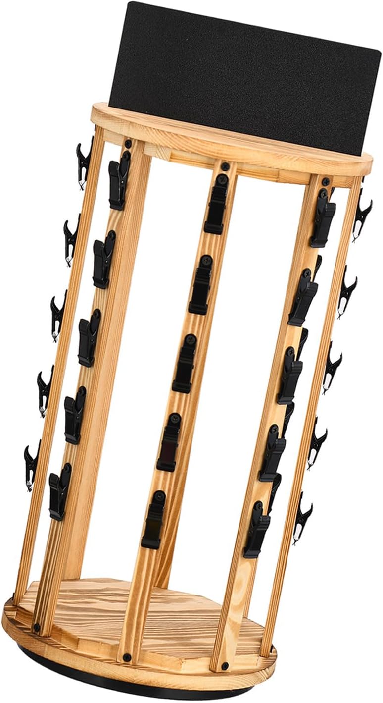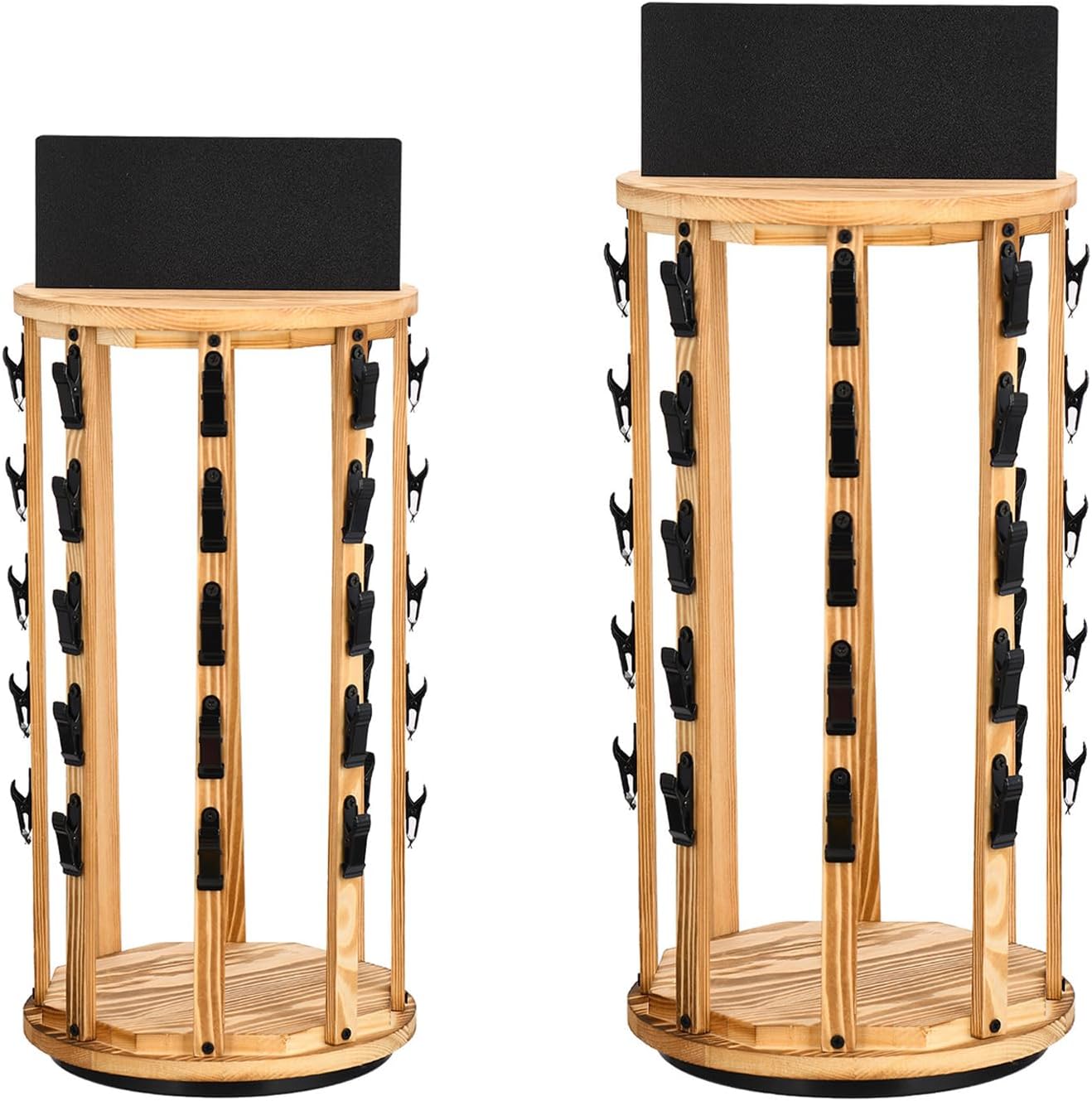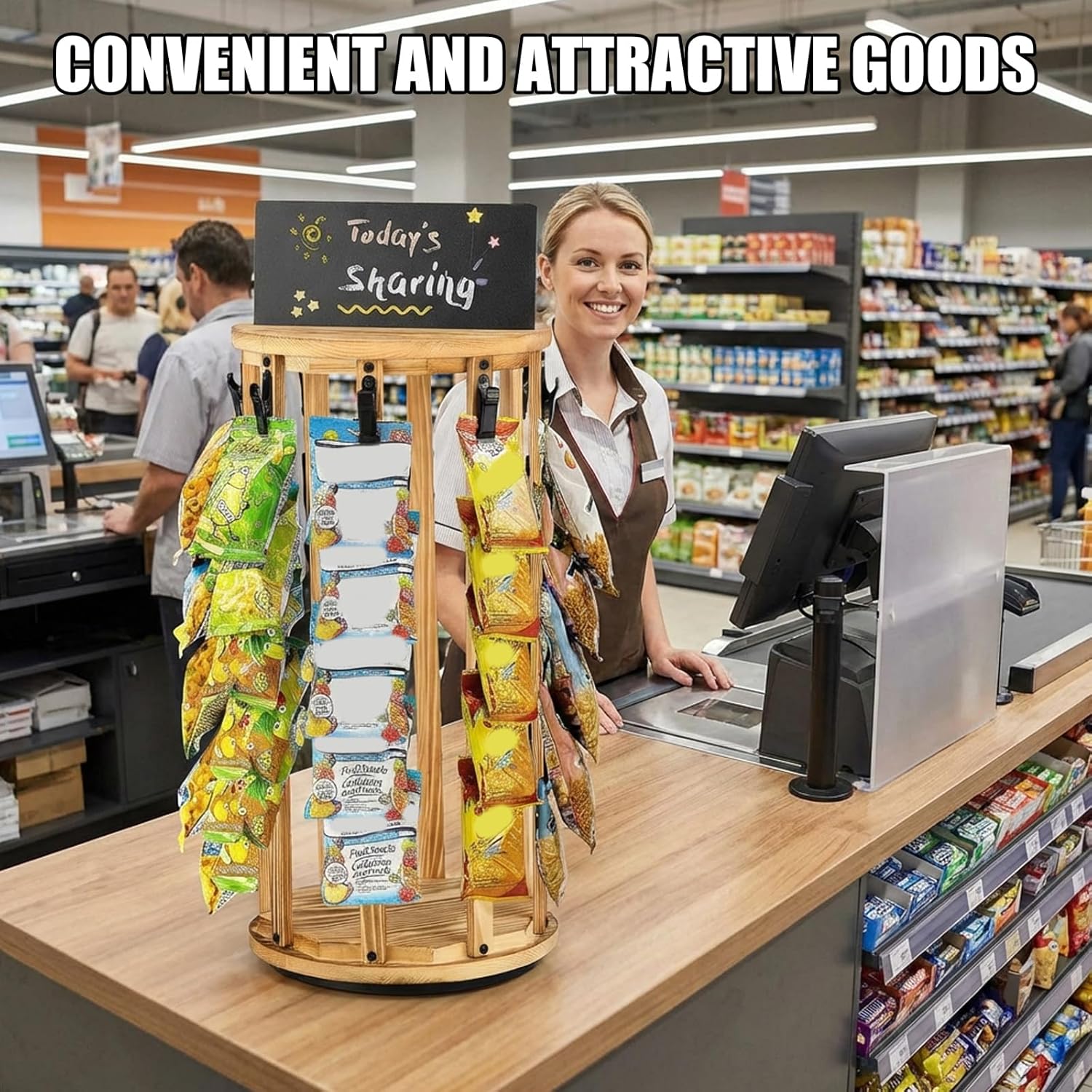 Wooden Storage Rack With Turning Base And Removable Clips Holds Chips Candy Treats Features: Smooth Motion Display: revolves for easy access to your favorite treats! This 5 shelf holder features a sturdy wooden moving base, allowing you to reach chips, sweets, or snacks from any position without knocking over packages Adjustable & Removable Clips: Customize your setup with removable clips! Modify they conveniently to fit various package sizes, from small packs to large chip bags Sturdy & Balanced Construction: Built as a loyal display unit, the metal frame is securely fixed to the wooden base for enhanced balance contains multiple rows of snacks firmly Built In Writing Area: Features a functional chalkboard to label snacks, highlight deals, display prices, or add fun messages! Great for attracting attention in shops or markets, and adding individualized touches to home gatherings Quick Assembly & Multi Purpose Use: Ready in minutes—all required components and tools included! The simple design enables fast setup and takedown Compact yet strong, it works as both a home storage option and commercial display for shops, functions, and everyday use Specifications: Substance: wood Attribute: natural wood color Craftsmanship: fine grinding, smooth face without burrs, green paint care Usage scenarios: Suitable for display and storage household kitchens, living rooms, offices and other occasions Practicality: Sturdy structure, easy to assemble and disassemble, saving space, for taking and organizing snacks Package Includes: rack×1 Note: Pay attention to the storage methods