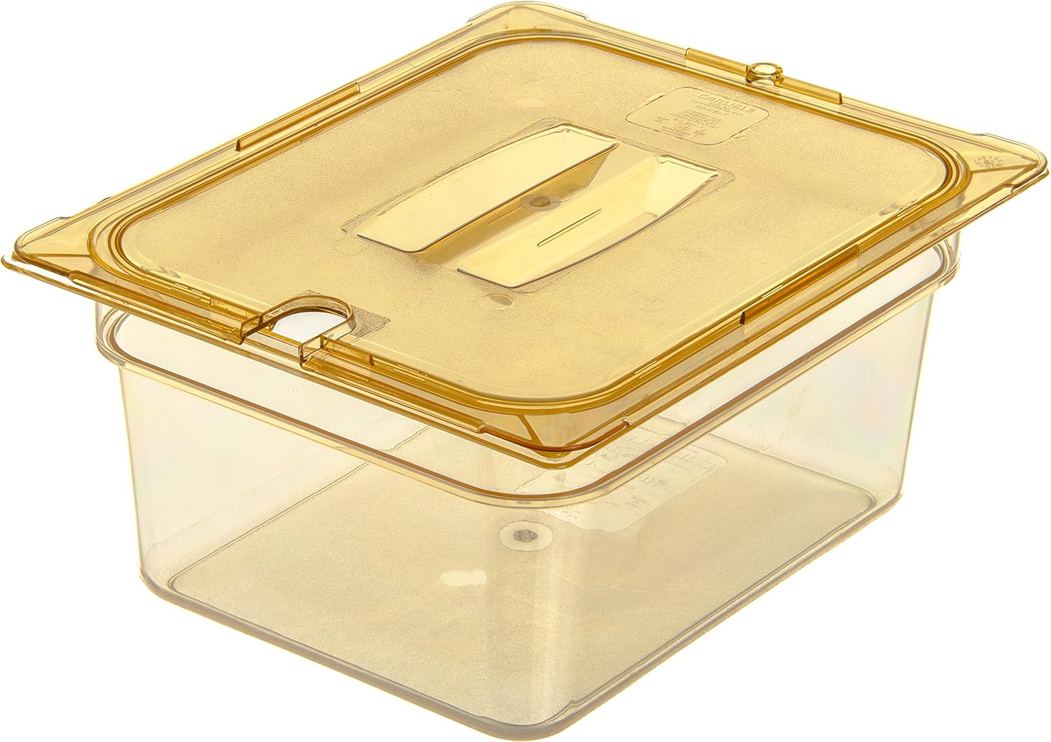The Carlisle FoodService Products Storplus Full-Size High Heat Food Pan is crafted to meet the demands of catering, buffets, and restaurant kitchens. In an amber hue and constructed from high-heat plastic, this pack of 6, 6-inch deep 1/2-size food pans takes versatility and durability to the next level. Purposefully crafted for high-heat applications, it thrives in food wells, holding ovens, and microwaves, ensuring your culinary creations stay at the perfect temperature without compromising quality. Featuring spoonable bottoms with rounded interior corners, this food pan is a game-changer. Removing contents becomes a breeze, reducing food waste and streamlining your serving process. This 1/2-size high heat food pan is not just about looks; it's built to withstand the rigors of a bustling kitchen. The reinforced rim and corners add an extra layer of durability, preventing chipping, cracking, and breaking, ensuring a reliable kitchen companion. Save valuable kitchen real estate with the stackable design of these high heat food pans. Neatly stack them together without fear of damage, providing a space-efficient solution for your storage needs. The textured surface of the pan's non-slip base reduces visible signs of wear and minimizes slipping, ensuring a safe and secure kitchen environment.