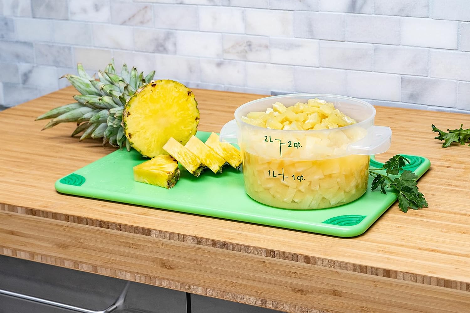 Elevate your kitchen efficiency with the Carlisle FoodService Products Storplus Round Food Storage Container – the essential companion for catering, buffets, and restaurants. This high-capacity container holds 2 quarts and redefines the way you store and organize culinary creations. Experience the benefits of expansive storage as the Carlisle Storplus Container effortlessly accommodates 2 quarts of your delectable dishes. Ideal for the dynamic demands of catering, buffets, and restaurant settings, it ensures you're always prepared for any culinary challenge. Crafted from robust polycarbonate (PC), this food storage container is a stalwart in busy kitchens. Tough against staining, breaking, and chipping, it guarantees longevity in the rigorous environment of a restaurant, where durability is non-negotiable. Designed with spoonable bottoms, these containers revolutionize the way you handle food storage. Say goodbye to wasted leftovers – now, you can easily access every last bit, promoting efficiency and reducing food waste. Cleaning becomes a breeze, streamlining your kitchen operations. Transporting filled containers is a breeze with the inclusion of molded handles. Enjoy a secure and comfortable grip, ensuring smooth handling in the fast-paced environment of a restaurant. Efficiency meets ease, making these containers a must-have in any culinary setting. Stay organized with capacity indicators that allow quick measurement in liter, half-liter, quart, and half-quart increments. Prioritize food safety with date indicators, enabling proper tracking of food items by recording names, date made, and use-by dates.