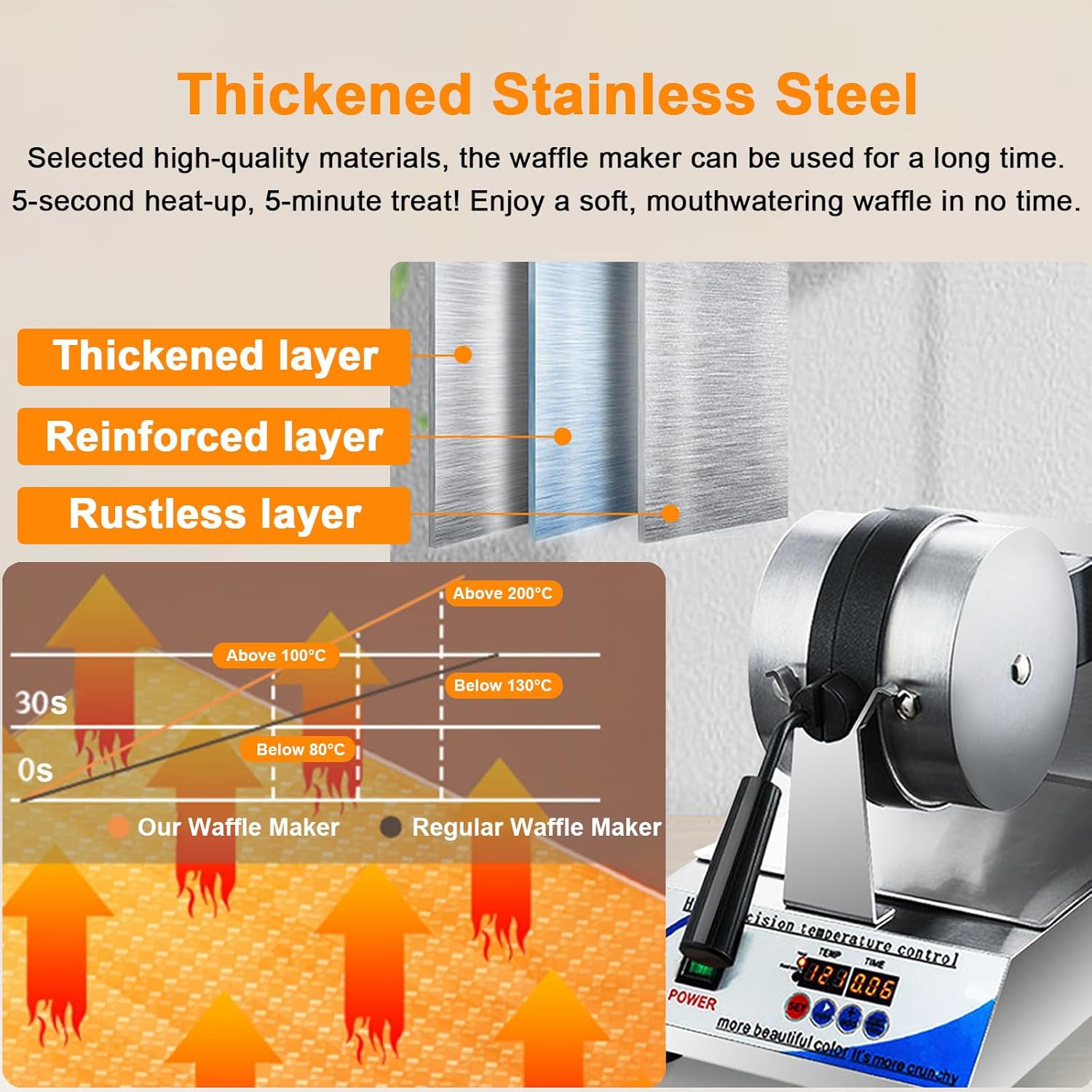 Create delicious waffles effortlessly with our premium waffle maker, designed for both home and commercial use. This versatile appliance allows you to whip up a variety of mouthwatering options, perfect for breakfast, brunch, or afternoon snacks. Imagine serving fluffy waffles topped with chocolate sauce, fresh fruits, or a scoop of ice cream to delight your family and guests. Ideal for restaurants, cafés, and snack bars, this waffle maker ensures that you can serve perfectly cooked, crispy waffles in just minutes, enhancing your menu offerings and attracting more customers. Key Features: - High power of 1200 W for quick operation, achieving optimal cooking temperatures in just 5 seconds. - Produces round waffles with a diameter of 18 cm (7 inches) and a thickness of 3 cm (1.18 inches), perfect for satisfying any sweet tooth. - Digital temperature control from 0-299℃ (32℉-570℉) and a timer range of 0-9 minutes, giving you precise control for perfect results every time. - 180-degree rotation feature ensures even batter distribution for uniform cooking. - Sleek stainless steel design adds a modern touch to your kitchen or service area. - Non-stick coating makes cleanup a breeze, letting you focus on what matters most—creating delicious treats. Whether you’re looking to impress guests at home or elevate your dessert menu at a café, this waffle maker is the ideal choice. Enjoy the convenience, efficiency, and delightful results that will keep your customers coming back for more. Specifications: - Power: 1200 W - Material: Stainless steel, aluminum - Waffle Size: Diameter 18 cm / 7 in, Thickness 3 cm / 1.18 in - Temperature Control: 0℃-299℃ (32℉ to 570℉) - Timer: 0-9 minutes - Product Dimensions: 45*25*32 cm / 17.72*9.84*12.6 in - Weight: Net 8.7 kg, Gross 10 kg Included in the package: - Commercial Waffle Maker * 1 - Baking Tools Kit * 1 Elevate your waffle-making experience and delight your taste buds with our advanced waffle maker!