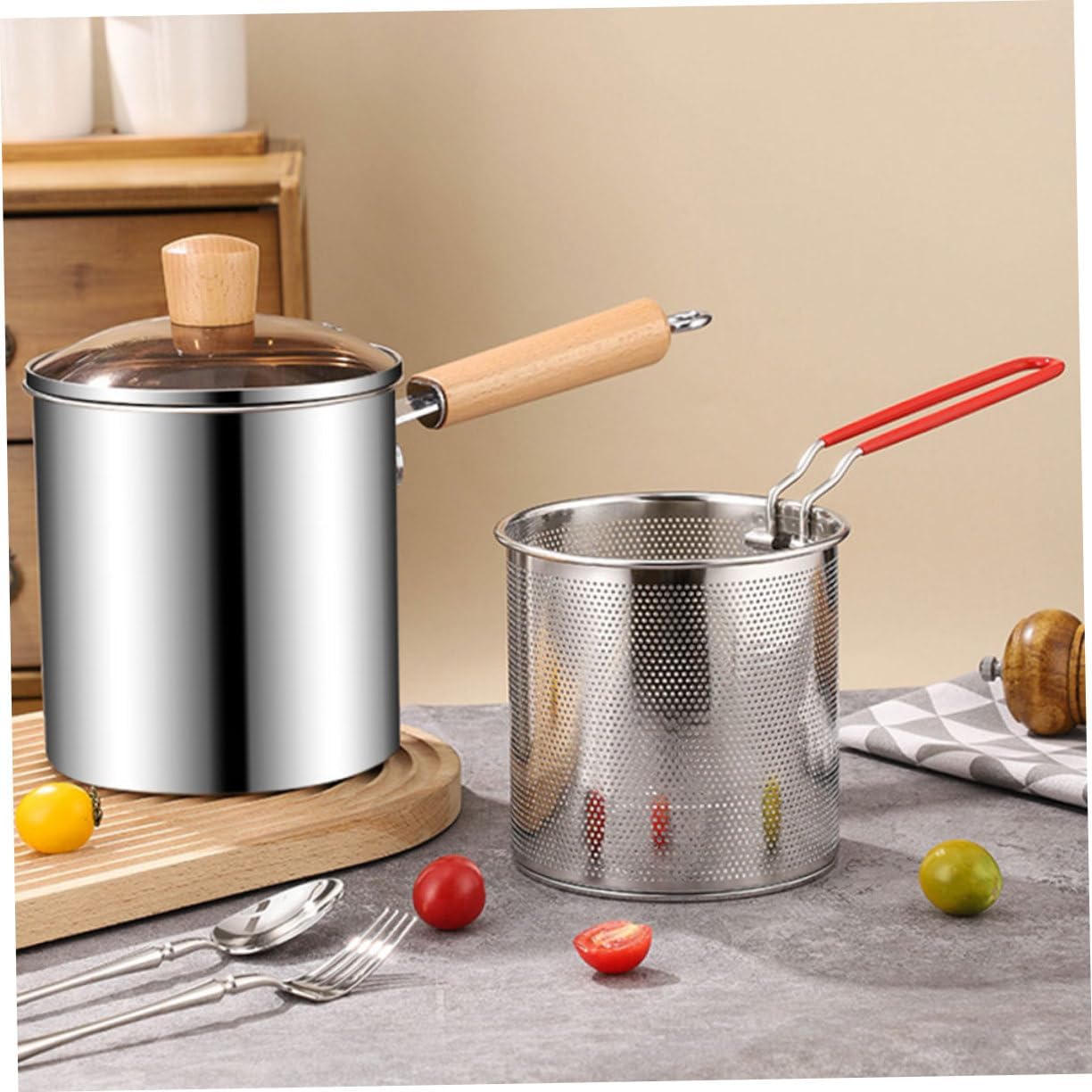 Package List 1 x frying pot 1 x frying basket 1 x tong Characteristics -Material:Stainless steel, wooden frying pot -Size:34.00X22.50X16.00cm/13.36X8.84X6.29in(frying pot) nonstick fryer -Size:23.50X4.50X2.00cm/9.24X1.77X0.79in(tong) fry baskets -Size:30.00X14.00X13.50cm/11.79X5.50X5.31in(frying basket) fry basket for pot -Frying pot capacity: 3L mini deep fryer basket -Color:Assorted Color metal fry basket -Made from stainless steel, this fryer is built to last. You can use this frying pot set with confidence pot with fry basket. -The wooden handle not only prevents burns but also adds touch of style to this easy-to-operate mini fryer fry baskets with handle. -With a large capacity, this fryer is for preparing family-sized meals. Meet your different frying need household fryer pot. -Enjoy cooking with minimal oil using this stainless steel deep fryer for home use, can widely used in daily frying pot with tong. -The frying basket and food clip make it easy to fry your favorite foods to be delicious, give you convenience food fried basket.Goods Informationfrying basket Equipped with a frying basket and food clip, it's easy to fry a variety of foods.round fryer basket This stainless steel deep fryer is for home use, allowing for healthy cooking with oil.deep fryer basket Its capacity is for feeding the whole family, and its stainless steel construction durability and safety