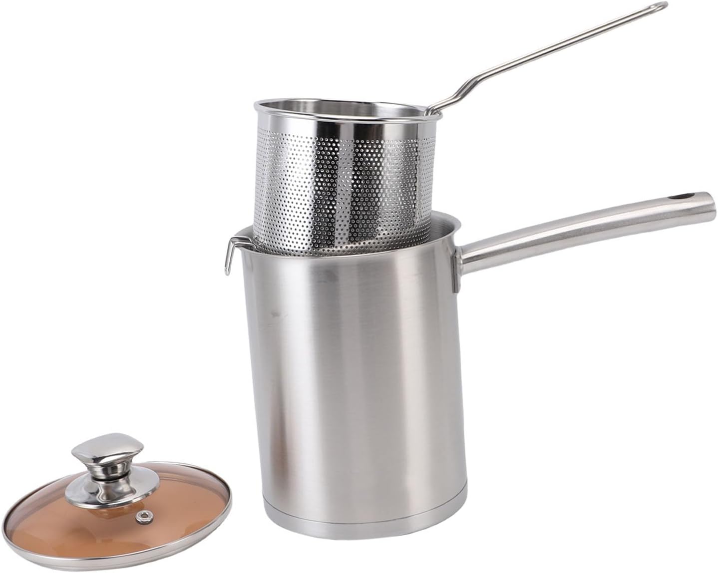 1. [ MATERIAL] Made of 304 stainless steel for safety and durability 2. [EFFICIENT OIL FILTERING] Equipped with oil filter basket for healthier frying 3. [VERSATILE USE] Suitable for small kitchens and larger quantities of food 4. [EASY STORAGE] Compact and lightweight design for easy organization 5. [COST SAVING] Requires less oil for frying, saving on oil costs Spec: Item Type: Mini Deep Fryer Pot Product Material: 304 Stainless Steel Deep Pot Size: Approx. 14.5 x 18cm / 5.7 x 7.1in Pot Handle Length: Approx. 16.5cm / 6.5in Filter Basket Size: Approx. 11.5 x 15.5cm / 4.5 x 6.1in Basket Handle Length: Approx. 15cm / 5.9in Pot Lid Diameter: Approx. 14.5cm / 5.7in Weight: Approx. 1173g / 41.4oz PackageList: 1 x Fryer Pot 1 x Lid 1 x Filter Basket 1 x Clamp
