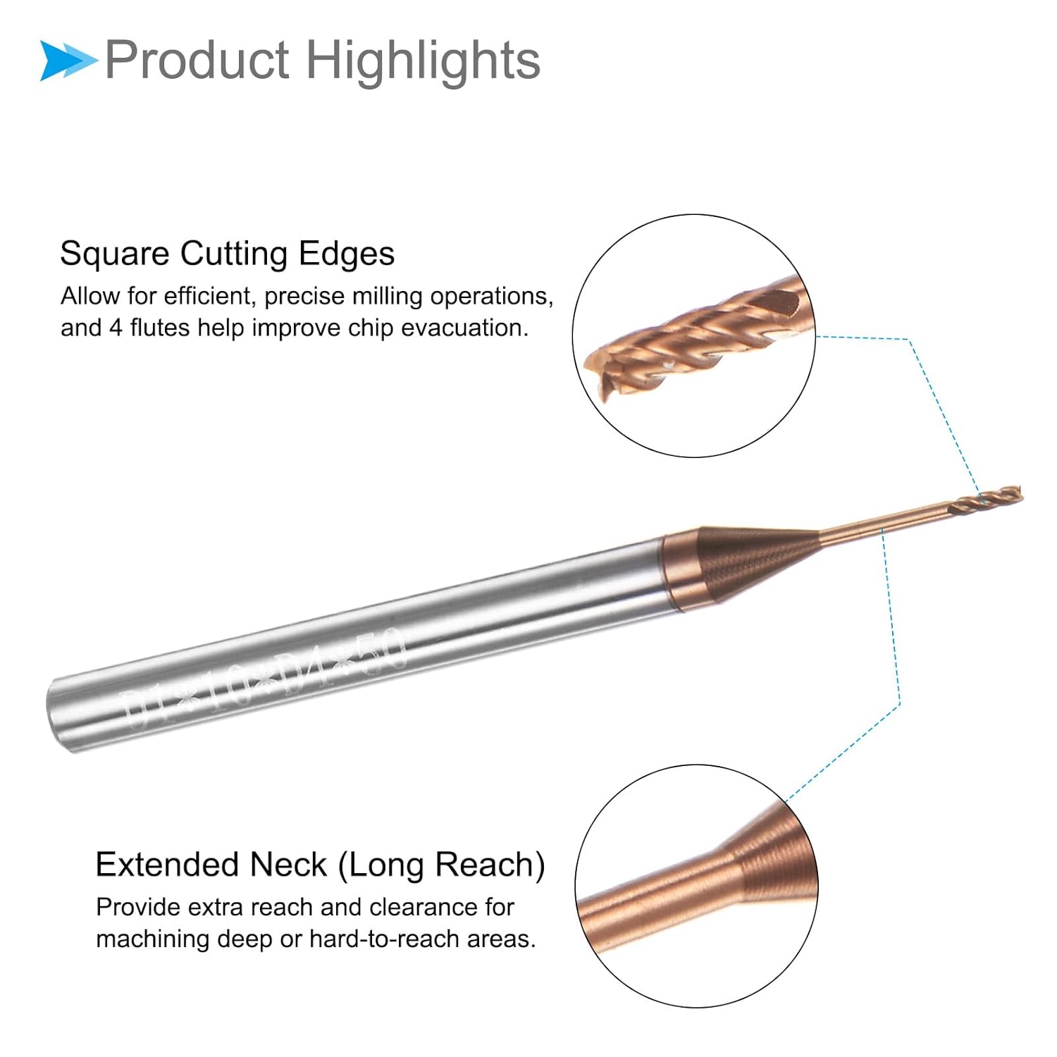 Attributes:* Cutting Diameter: 1mm / 0.04"* Effective Cutting Length: 10mm / 0.39" ( Flute Length: 3mm / 0.12"; Extended Neck Length: 7mm / 0.28")* Shank Diameter: 4mm / 0.16"* Total Length: 50mm / 2"* Material: Ultra-fine Grain Carbide* Finish: Titanium Coated (Nano-Scale Level)* Cutting Hardness: HRC55What Is Included:* 2 Pieces x Square Nose End MillsApplications & Features:--- The square nose end mill is suitable for creating flat-bottomed slots, pockets, or profiles. Used for machining carbon steel, stainless steel, cast iron, non-ferrous metals, aluminum and plastics. The end mill can be used with CNC milling machines, router machines, and engraving machines.--- This end mill is designed with an extended neck (long reach) to provide extra reach and clearance for machining deep or hard-to-reach areas. Square cutting edges allow for efficient, precise milling operations, and 4 flutes help improve chip evacuation and reduce the chance of clogging during working.--- The ultra-fine grain carbide provides excellent hardness (HRC92), wear resistance, good toughness, high strength, and good heat resistance. Titanium (nano-scale) coating increases hardness, wear resistance, tool life, reduces friction, improves chip evacuation, and enhances surface finish. Ultra-thin nano coating provides improved precision and can enhance performance. Used in applications that require moderate cutting speeds and feeds.Useful Tips:--- Make sure the end mil is securely seated and tightened. Use an appropriate coolant or lubricant to enhance chip evacuation and heat dissipation. Excessive heat can affect tool life and performance. Monitor and control the cutting parameters, ensure proper cooling or lubrication and effective chip evacuation to prevent clogging.