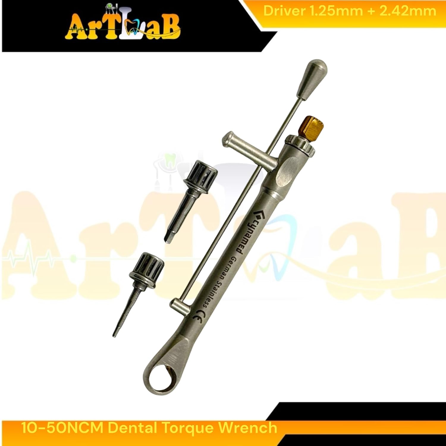 Torque Range: 10-50 Ncm. This range covers the torque requirements of most implant systems, making it a versatile tool for various implant procedures. Driver Bits: Includes two driver bits - 1.25mm and 2.42mm. German Stainless Steel Construction: Crafted from high-grade German stainless steel, this torque wrench is durable, resistant to corrosion, and built to last. Ergonomic Design: The wrench features a comfortable grip and smooth ratcheting mechanism, ensuring ease of use and reducing hand fatigue during use. Sterilizable: The tool can be sterilized using standard autoclave technique.