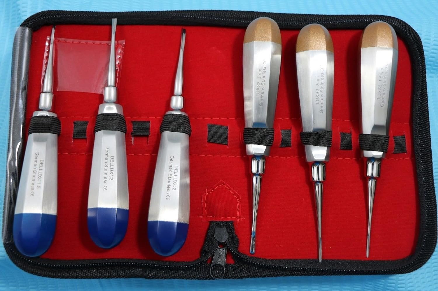 SAME AS PICTURE ( 100% MONEY BACK GURANTEED ) EXCELLENT QUALITY GERMAN STAINLESS STEEL-BLUE & HOLD HANDLE ITEM: GERMAN 6 PCS CURVED DENTAL SURGERY EXTRACTING EXTRACTION LUXATING ELEVATOR-BLUE + GOLD SET INCLUDES ONE EACH OF THE FOLLOWING: 1 EACH LUXATING ELEVATOR,STRAIGHT 1.5MM ( DEL LUX-C1.5 ) ( GOLD ) 1 EACH LUXATING ELEVATOR,STRAIGHT 2MM ( DEL LUX-C2 ) ( GOLD ) 1 EACH LUXATING ELEVATOR,STRAIGHT 3MM ( DEL LUX-C3 ) ( GOLD ) 1 EACH LUXATING ELEVATOR,CURVED 1.5MM ( DEL LUX-C1.5 ) ( BLUE ) 1 EACH LUXATING ELEVATOR,CURVED 2MM ( DEL LUX-C2 ) ( BLUE ) 1 EACH LUXATING ELEVATOR,CURVED 3MM ( DEL LUX-C3 ) ( BLUE ) COMING WITH A NICE ZIPPER KIT