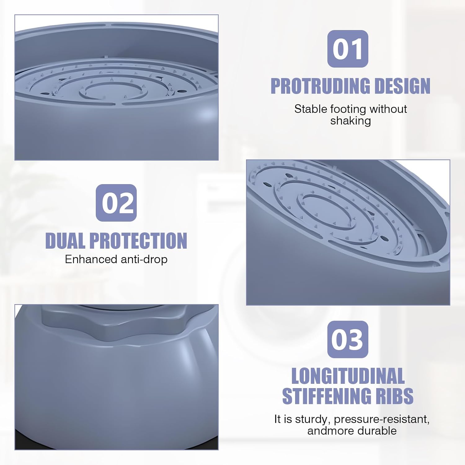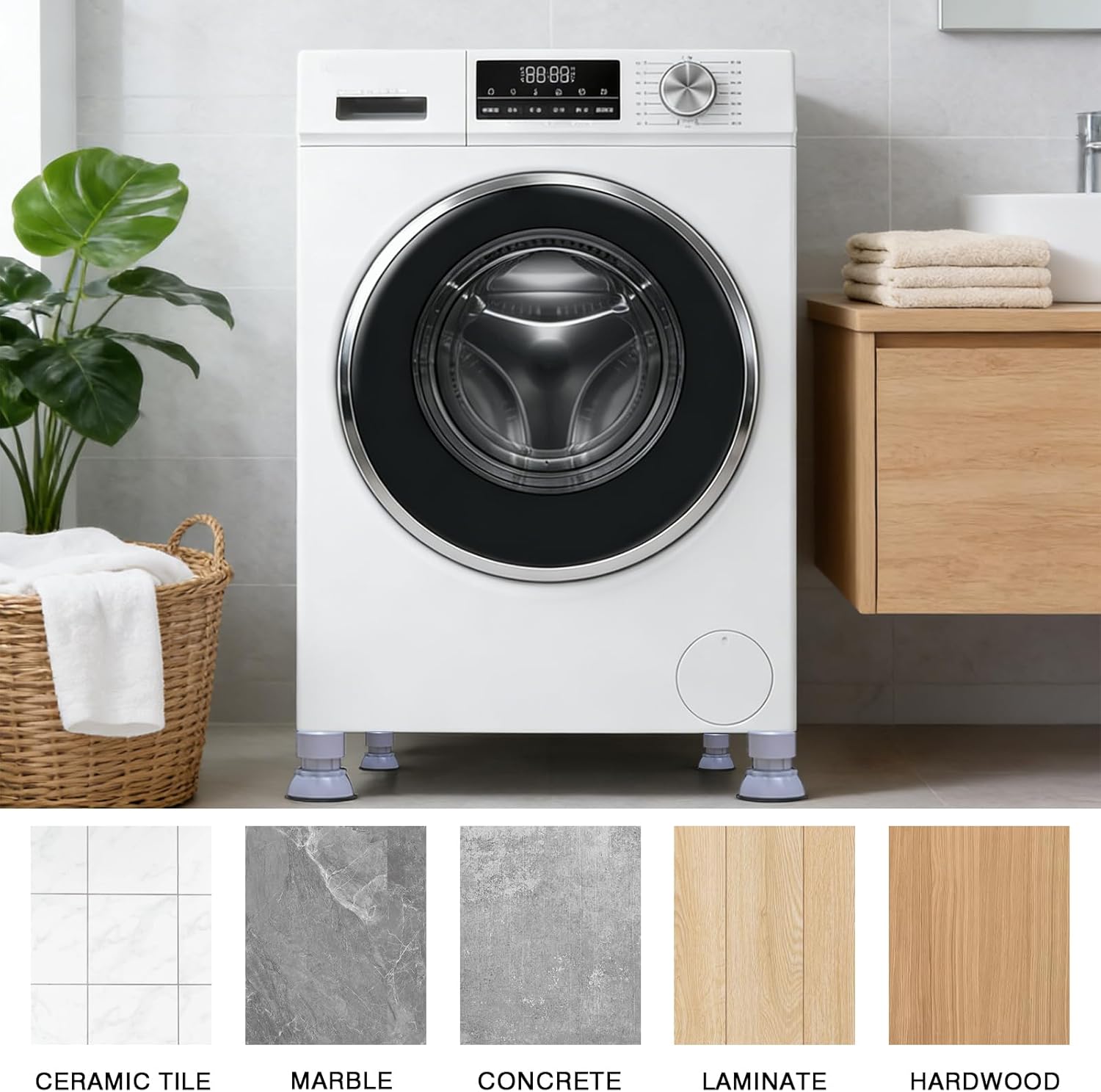 Quiet and stable stand for your appliances. These universal vibration dampers are designed to effectively reduce vibration, noise and load on the ground. Provide greater stability and comfort in daily life. Description Anti-vibration feet combine hard PP material with TPU elastic rubber. This reliably absorbs shock while keeping devices securely in place. Product Information: Material: PP Polymer + TPU Rubber Height adjustable: approx. 10-12 cm. Set of 4. Colors: black, grey Suitable for: washing machine, dryer, appliances and furniture Product contains: 4 x Universal Vibration Dampers IMPORTANT NOTES: Before use, make sure that the feet of the device are properly adjusted. Suitable for smooth and hard floors. Do not use as a toy.