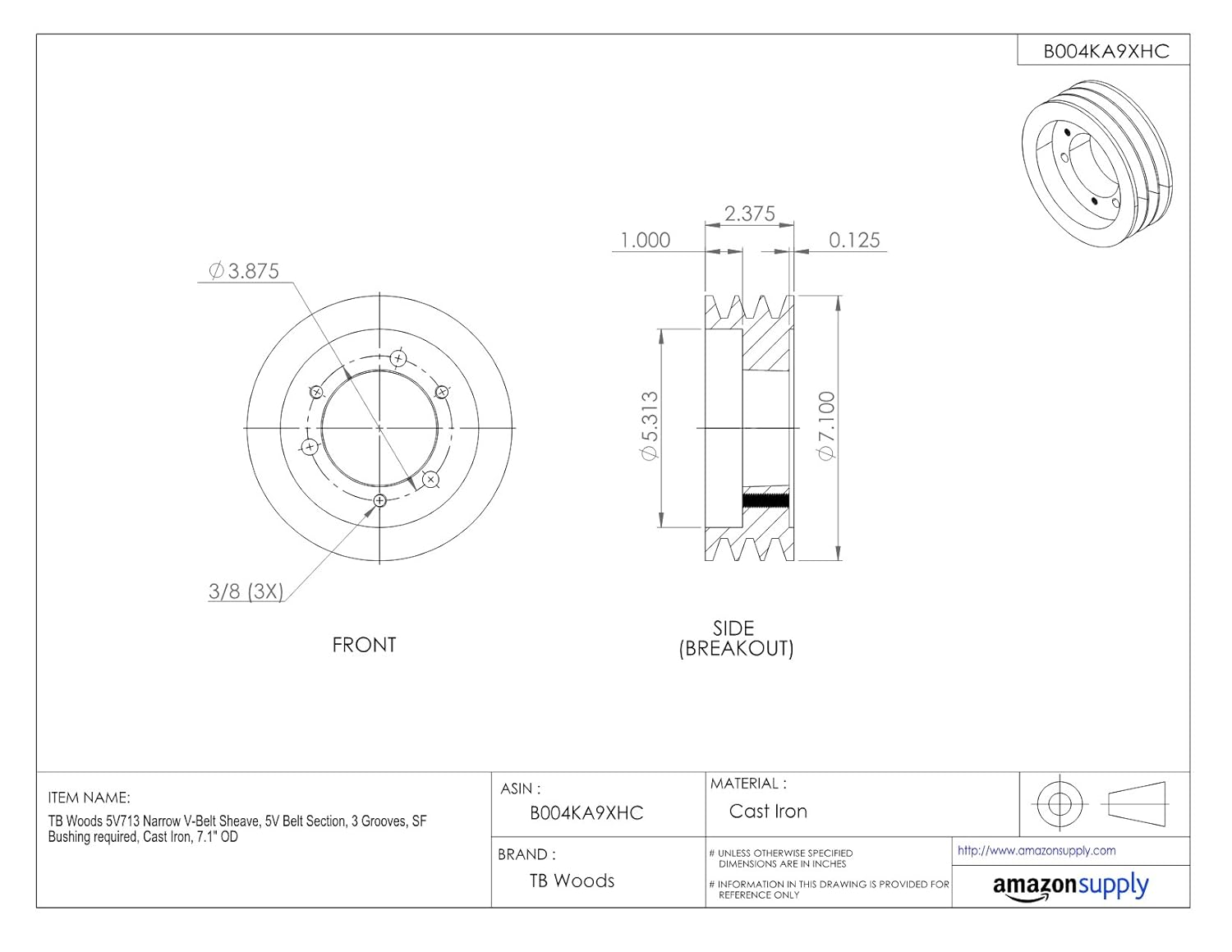 This TB Woods narrow V-belt sheave with a 5V belt section is made of cast iron and comes with three grooves. It is a narrow V-belt sheave that fits narrow profile V-belts , allowing the use of smaller or fewer belts than classical V-belts to transmit an equivalent load, maximizing power transmission efficiency by reducing drive weight and size. This pulley is made of cast iron for resistance to wear, corrosion, and galling. It has a 5V cross section and three grooves for use with multiple or banded belts. V-belt pulleys (sheaves) are used in a wide range of mechanical and electronic drives, including HVAC units, farm machinery, food processing equipment, and home appliances, among others.V-belt pulleys (sheaves) are the component in a power transmission drive that transmits power to the belt. Typically made of cast iron, the pulleys and the V-belts that loop around them match in form – wide (classical) or narrow, single or multi-grooved. V-belt pulleys are found in drive designs in the agriculture, textile, printing, mining, and office equipment industries.TB Wood's manufactures sheaves, V-belts, couplings, bushings, and other power transmission products. Founded in 1857, it is based in Chambersburg, PA.