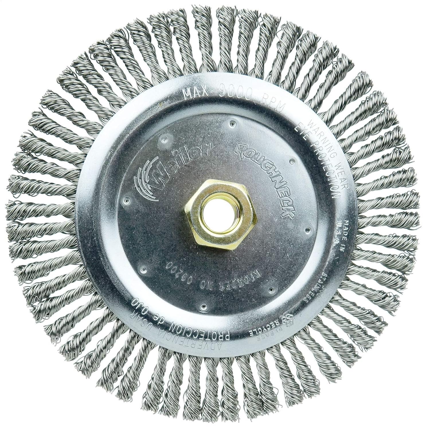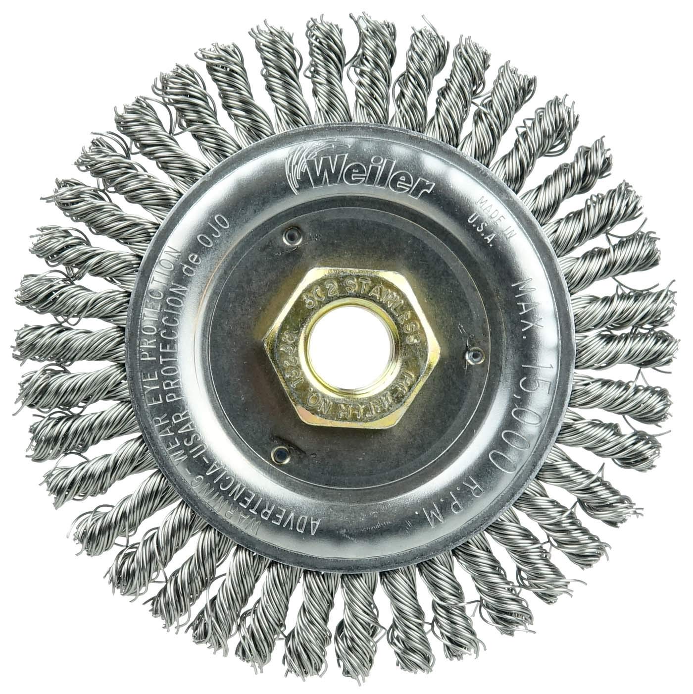 Weiler Roughneck Wheel Brush, Narrow Face Filler Pass, 6 in Brush Dia, 1/2 in Face Width, 5/8-11 Arbor Hole Size, Stringer Bead Knot Filament/Wire Type, 0.023 in Filament/Wire Diameter, Stainless Steel Fill, 1-3/8 in Trim Length, 12500 rpm Maximum, Threaded Arbor Attachment. Our premium weld cleaning brushes are designed and manufactured to the most stringent quality standards in the industry. Weiler stringer bead wheels utilize the highest quality wire available and feature a twist that puts all of the sharp tips at the very end of the knots, making them the fastest, most aggressive weld cleaning tools on the market. At Weiler, we passionately embrace change to improve our products and our processes to move the company and our customers forward. By bringing new ideas and creative problem solving together in an open, collaborative environment, we will improve our customers’ productivity and create profitable growth. Weiler Abrasives is eager to create a collaborative partnership to overcome your toughest cleaning, grinding, cutting, de-burring and finishing challenges. Weiler manufactures precision brushes, abrasives, and maintenance products. The company was founded in 1898 in Germany, is headquartered in Cresco, PA, and is International Organization for Standardization (ISO) 9001 certified.