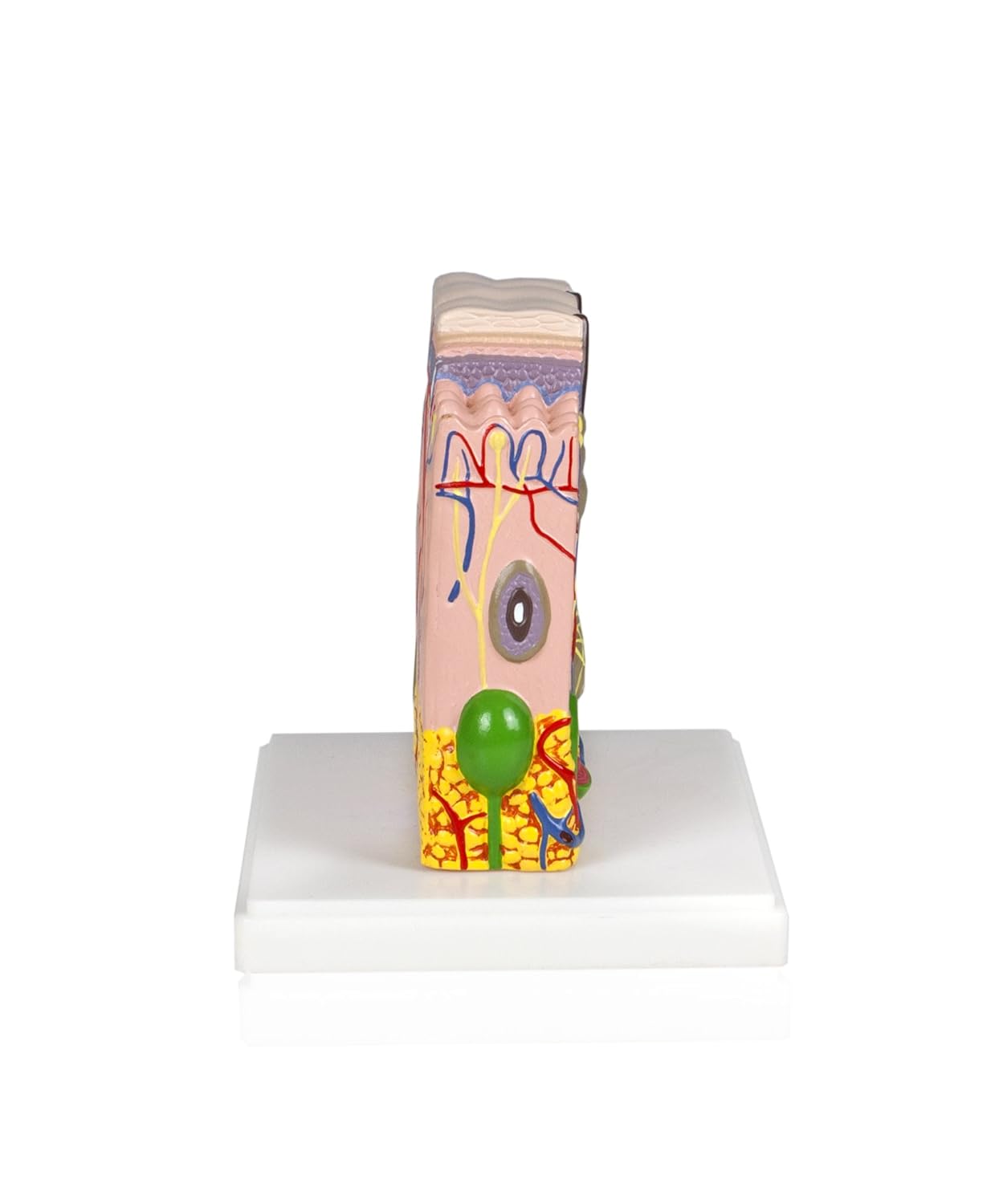 This plastic model is enlarged 50X from a human scalp section. This relief model displays contrasting colors of the three skin layers–epidermis, derm, and subcutis, with nerves, sweat glands, hair roots and vessels. Labeled diagram included.