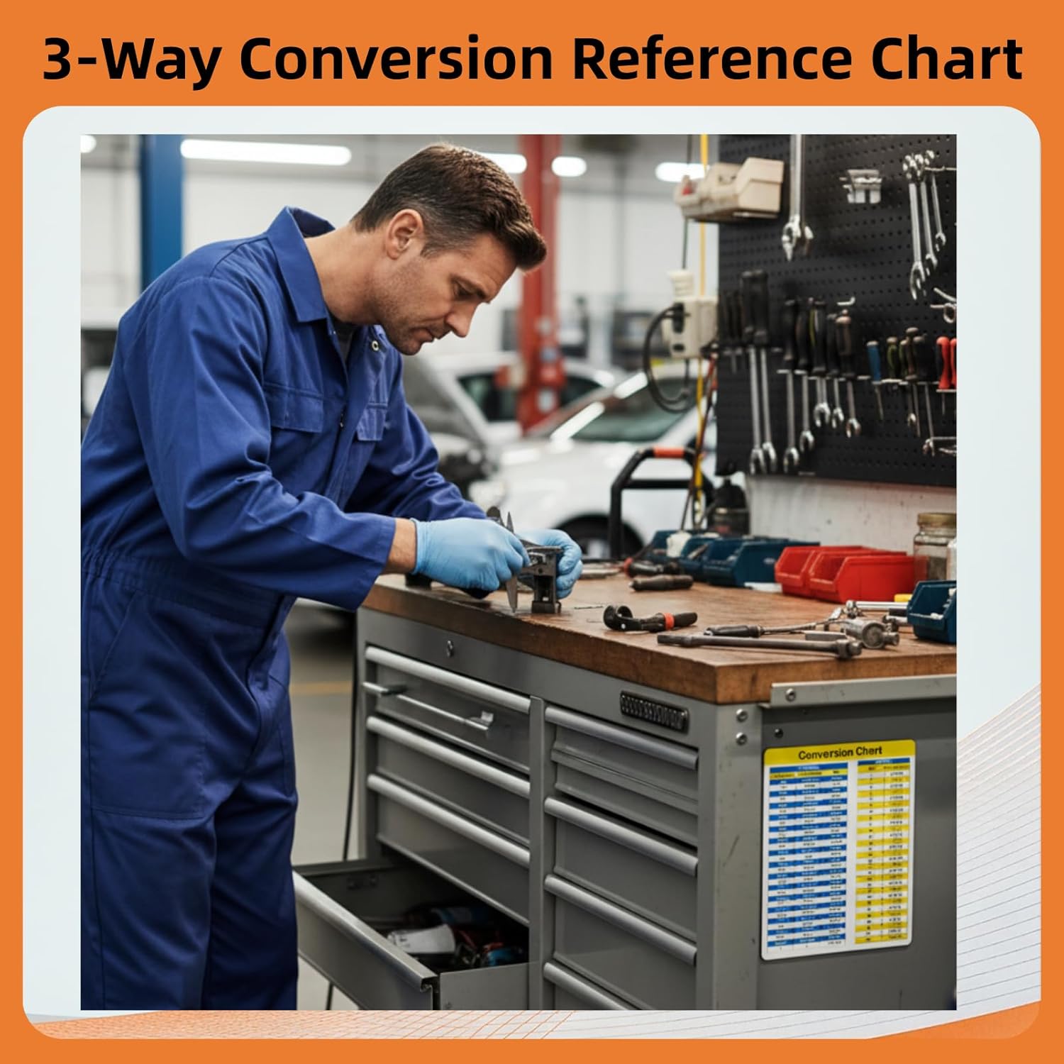 This 6×8” magnetic size conversion chart integrates fractional inches, decimal inches, and millimeters for quick imperial-metric reference. Magnetic backing mounts to toolboxes or machinery, offering clear visibility for machining, repair, and installation work.