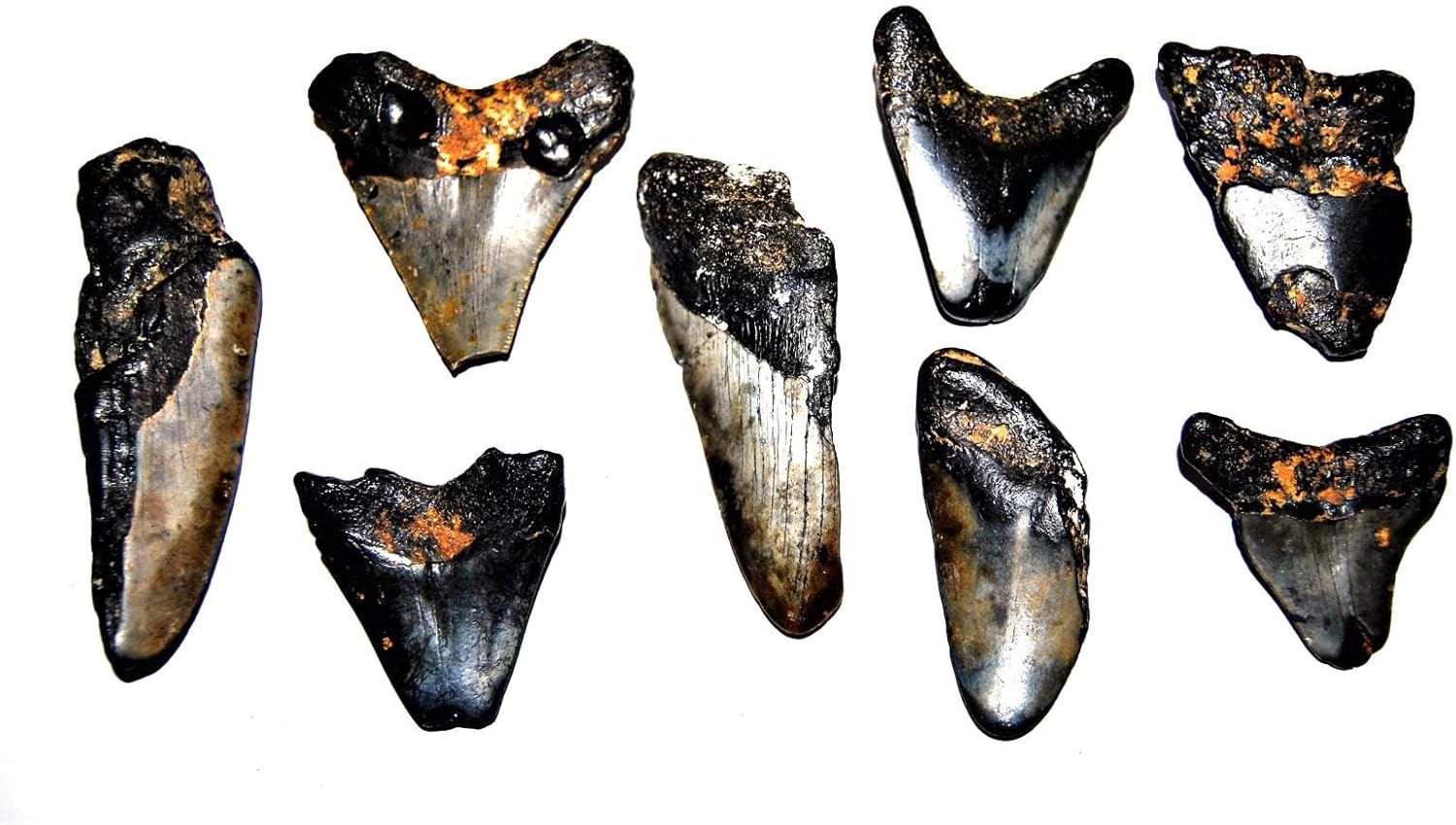 This is a nice set of 8 partial Megalodon teeth. These teeth measure between 2-4 inches in length at the longest point. Megalodon teeth are very popular among fossil collectors, but complete teeth can be very expensive. These partial teeth are a great opportunity to enjoy a fossil from this amazing prehistoric creature for a reasonable price! Also included with the fossils are 8 copies of a nice color informational label. These would be great for small gifts! Megalodon is an extinct species of shark that lived approximately 25 - 1.5 million years ago. Fossil remains indicate that these powerful predators reached up to 52 feet in length. Their serrated teeth were not just good cutting tools, they were also well-suited for grasping powerful prey and would seldom crack even when slicing through bones.