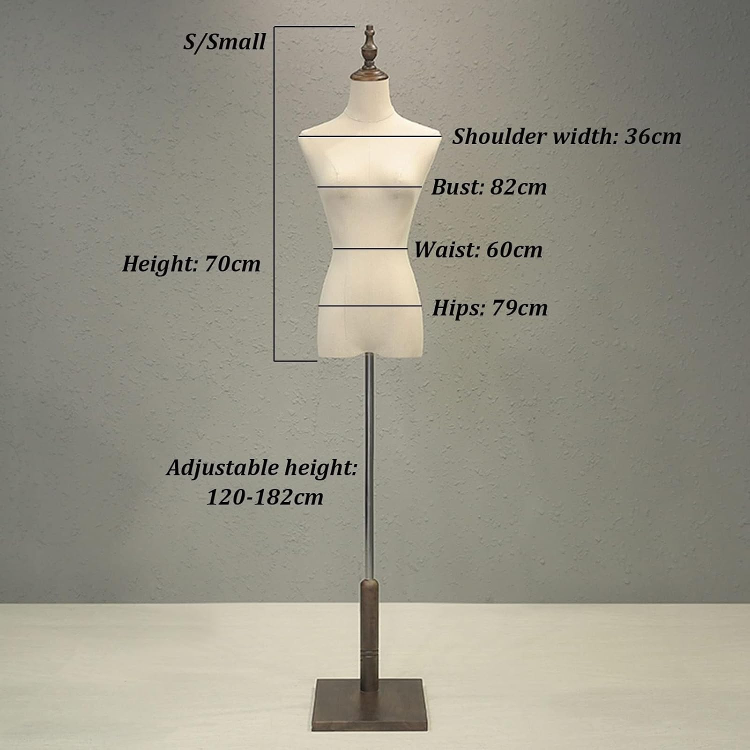 This female mannequin torso is a versatile and elegant solution for displaying garments in style. Crafted from lightweight PE material and wrapped in soft linen fabric, the dress form is gentle on clothing while offering a sleek and professional appearance. The adjustable wooden arms allow for customizable poses, making it easy to showcase shirts, jackets, dresses, and more.The height-adjustable metal pole (120–182cm) adapts to different garment lengths—from crop tops to full dresses—making it ideal for tailors, boutiques, and photography studios. Its sturdy wooden base ensures balance and durability, while the detachable parts allow for easy assembly and storage.Whether you're dressing a storefront window, preparing for a photoshoot, or creating your next DIY masterpiece, this mannequin provides the ideal foundation for creative fashion display.Product name: mannequin body torso / female maniquins bodyMaterial: PEArm material: solid woodBody Material: LinenBase Material: solid woodBase Color: Wood colorBase Type: triangle , square , european squareFeatures: adjustable, detachable, easy to assembleSize:S: shoulder width: 36cm, bust: 82cm, waist: 60cm, hip circumference: 79cm, height: 70cm, adjustable height: 120-182cm;M: shoulder width: 38cm, bust: 86cm, waist: 64cm, hip circumference: 84cm, height: 73cm, adjustable height: 120-182cm.Applicable occasions: clothing store, home handicrafts, store display, clothing production, fashion design, window, counter, shopping center, interest courses, classrooms, training courses??Package list:1x Manikins