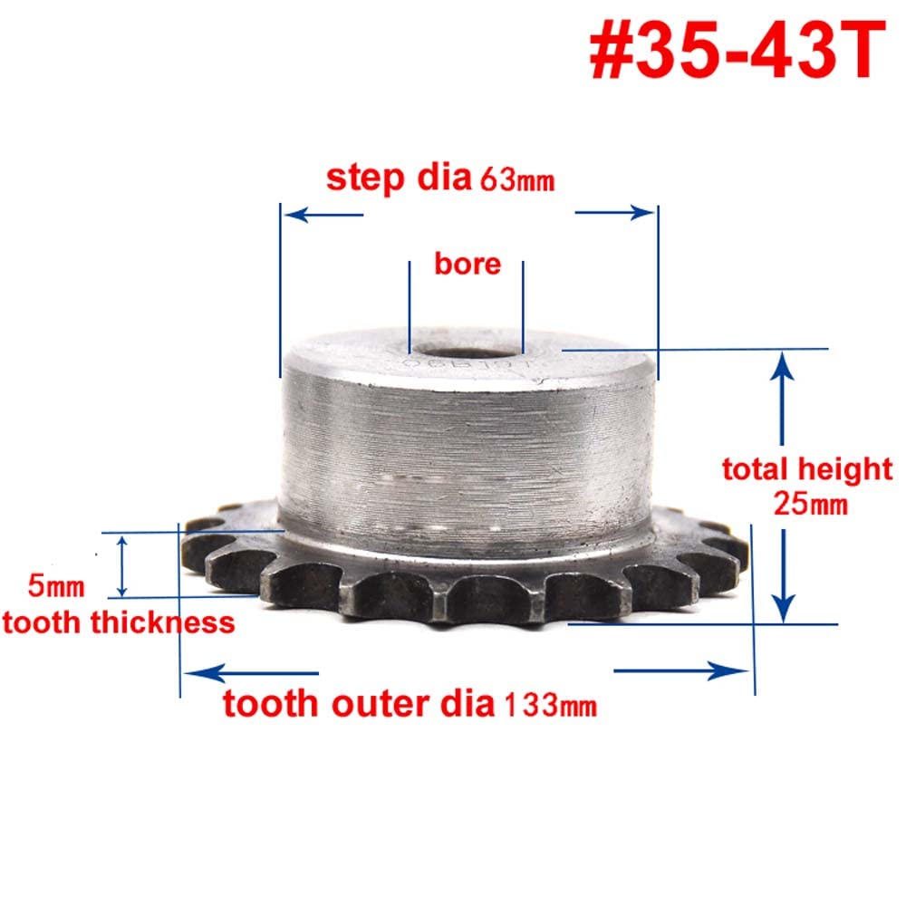 Specification:Model: #35 Chain Drive Sprocket Wheel 43T For #35H 06B Roller Chain without Set Screw holesMaterial: A3 steelTeeth pitch: 3/8" (9.525mm)Tooth thickness: 5mmBore: 16-18mm (ROUGH MACHINING, without set screw holes)Package Including:1pcs