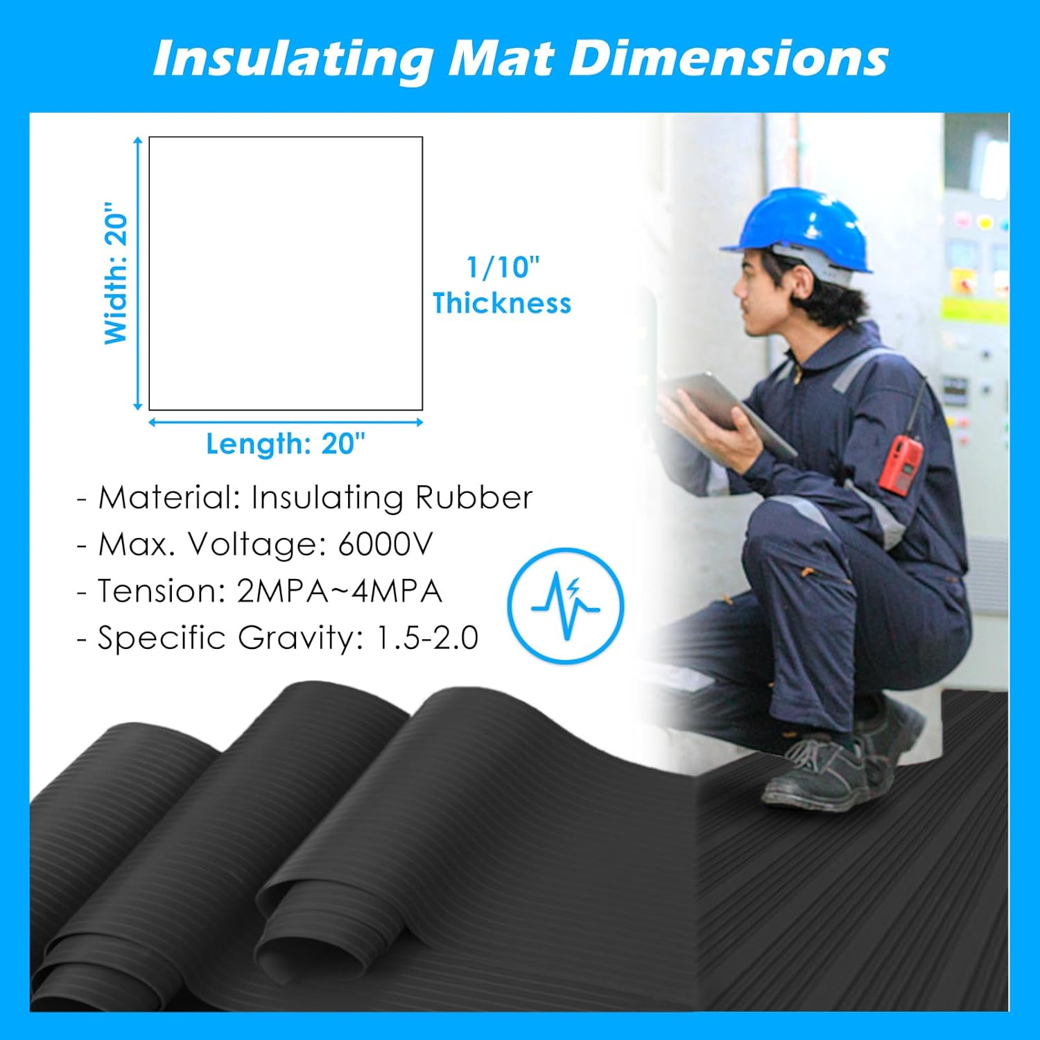 20" x 20" Electrical Safety Mat 6000V Insulated, High Voltage Insulating Rubber Floor Mats for Home Commercial Work Spaces, Large Non-Slip Switchboard Matting