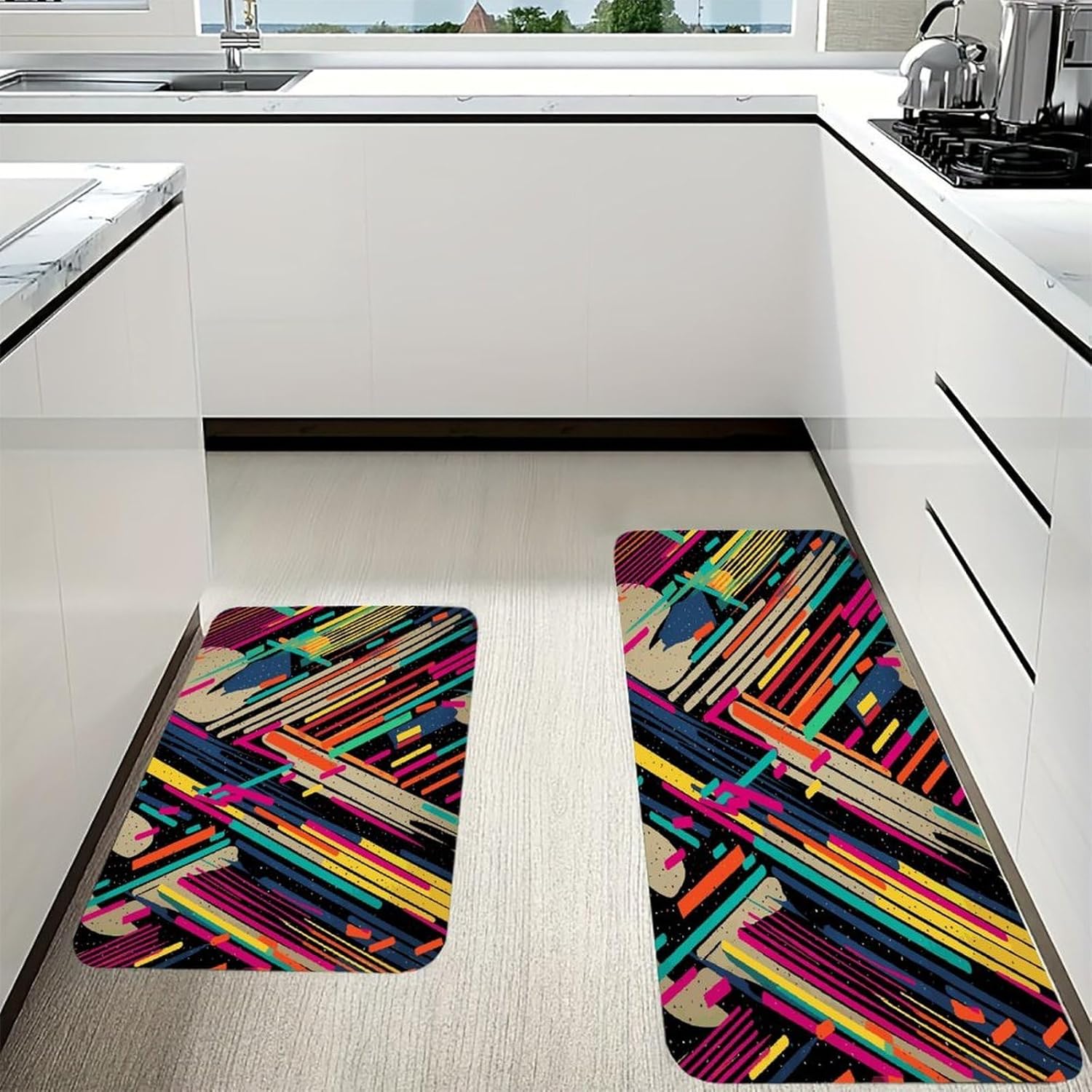 Step into instant comfort with our 2-piece Cushioned Anti Fatigue Mat set, designed to transform every standing moment into a relaxing experience. As a Comfort Desk Mat, it also eases the strain of long workdays, making it a versatile addition to any home.The Cushioned Anti-Fatigue Non-Skid Rug core offers plush support that hugs your feet, reducing the tension that comes with standing for hours. Unlike thin, flimsy alternatives, this Striped Abstract Colorful Kitchen Rug is made with pill-resistant flannel that stays soft and neat through repeated use. It doubles as a Non Slip Comfort Standing Mat in your laundry room, taking the stress out of folding clothes or loading the dryer.Perfect for modern and rustic spaces alike, this Farmhouse Anti Fatigue Mat combines style with practicality. Use the Cushioned Kitchen Rug in your bathroom for a soft step out of the shower, or bring it outdoors for a comfortable spot to garden. Every detail is crafted to fit your busy lifestyle, from the easy-to-clean fabric to the multi-room functionality that makes this set a household staple.