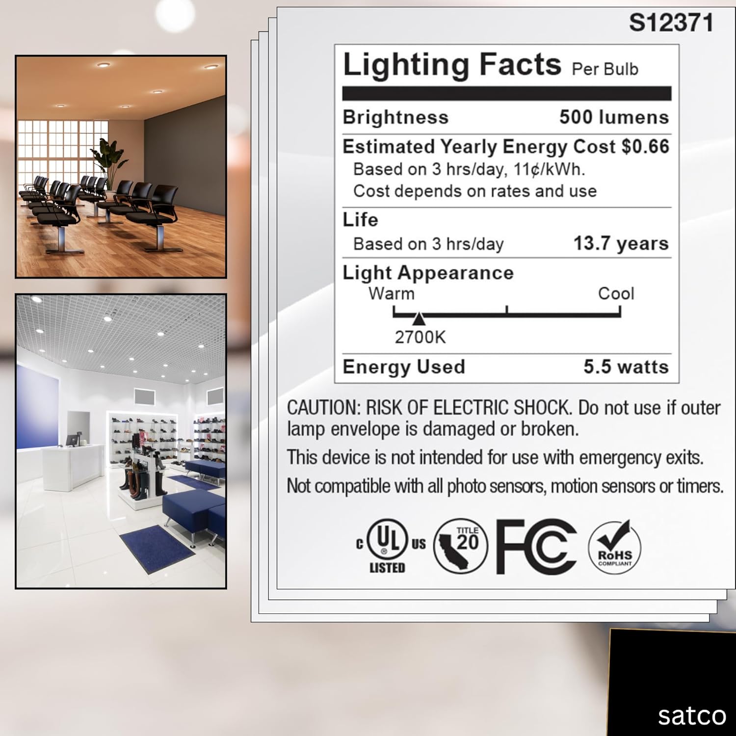 The Satco S12371 LED MR16 floodlight is a compact, high-efficiency lighting solution engineered for standard 120V applications. Consuming only 5.5 watts, this lamp replaces traditional 50W halogen bulbs while delivering 500 lumens of soft 2700K warm white light. With a 36° flood beam and a high CRI of 90+, it provides wide, accurate illumination ideal for residential and commercial settings. The GU10 twist-lock bi-pin base allows for quick and secure installation in directional fixtures, making this lamp ideal for track, recessed, or accent lighting. It's dimmable with compatible systems, enabling full brightness control, and approved for use in enclosed fixtures and damp locations. With a rated lifespan of 25,000 hours, IP20 moisture protection, and compliance with cULus, RoHS, and FCC certifications, the S12371 offers long-lasting performance and energy savings. It's backed by a 5-year warranty and provides a reliable, high-quality lighting upgrade.