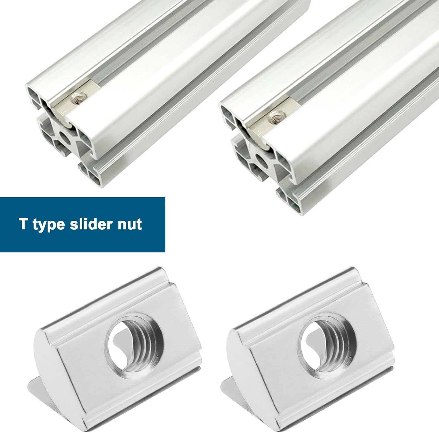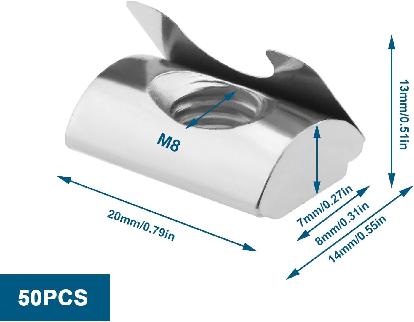 Item Descriptions:-These slot nuts are fit for 4040 aluminium profiles, slot 8mm, thread diameter: M8. Please confirm the depth of the groove before placing an order. If the groove of the profile is deep, it is recommended to use a nut with shrapnel.-Made from carbon steel, have high hardness, surface is Nickel-plated for good rust resistance.-Easy to use, smart design with spring sheet Inserting a nut roll into the slot and twisting with a screw locks the nut in place.-Only suitable for aluminium profiles that comply with European standards. Not suitable for custom aluminium profiles.-Used in the construction of CNC routers, 3D printers, CNC cutters, robot projects, 3D engraving machines, etc.Package:50x Spring T-NutsItem Specifications:Material:Carbon SteelColour:SilverFastener type:T-SlotModel:4040 Series-M8