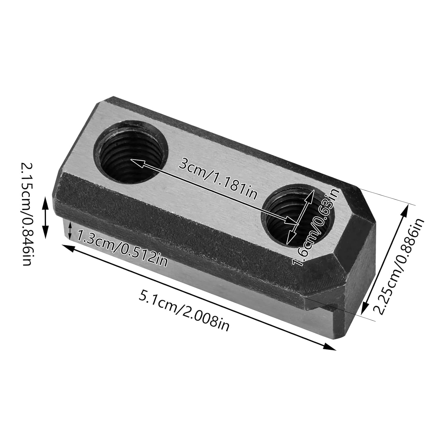 Specification:- Material: 45# Steel- Compatible Devices: 10 Hydraulic 3-jaw Hollow Chuck (Not Included)- Number of T Nuts: 3- Number of M12 Bolts: 6- Hardness: 30-35 HRC- Center Distance: 30mm/1.181in- Each T Nut Size: 51*22.5*21.5mm/2.008*0.886*0.846in- Package Size: 10*8*4cm/3.94*3.15*1.57in- Gross Weight: 0.6kg/1.32lbs- Net Weight: 0.5kg/1.10lbsPackage Included:- 3* T Nuts- 6* M12 BoltsNotes:1. Please verify the size before ordering.2. Compatibility may vary among different chuck brands and may require slight adjustments for a proper fit.